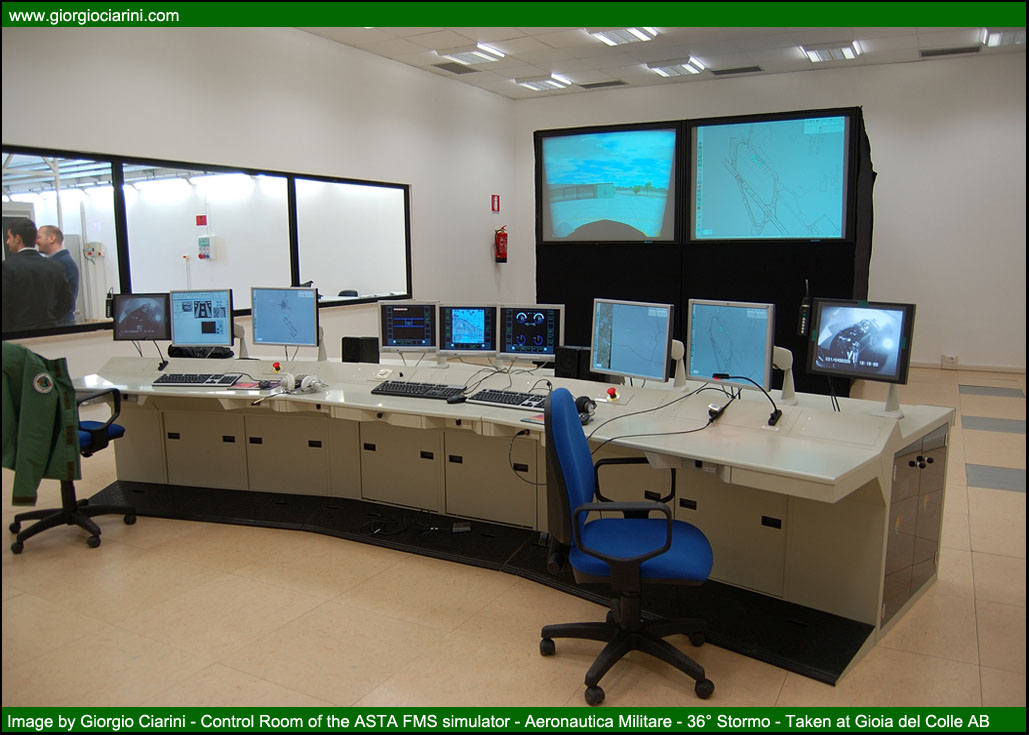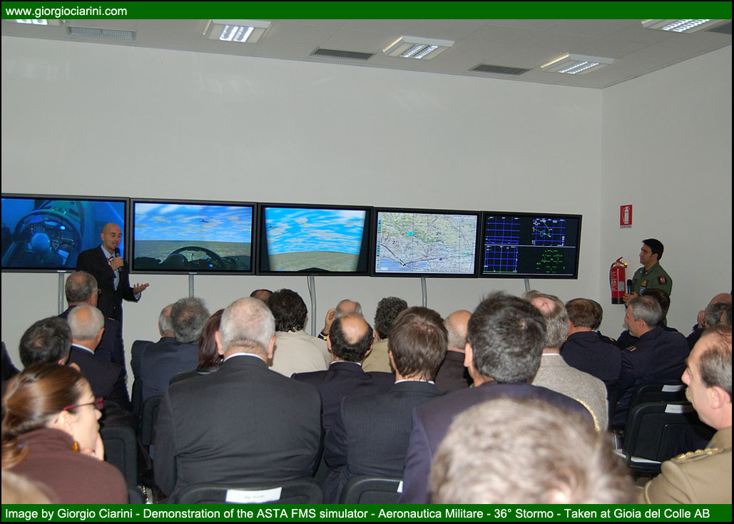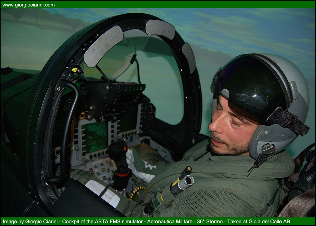 Dal 21 di aprile del corrente anno il XII Gruppo può avvalersi di un simulatore di volo Full Mission Simulator ASTA (Aircrew Synthetic Training Aids) simulatore di ultima generazione sviluppato con la partecipazione delle due società Finmeccanica, Alenia Aeronautica e Selex Galileo, ASTA è uno dei programmi più ambiziosi di addestramento lanciato in Europa. La Base Aerea di Gioia del Colle è la prima base dell’Aeronautica Militare ad avvalersi di questo nuovo sistema addestrativo, creato e realizzato con una perfetta sinergia tra la nostra Forza Armata e l’industria nazionale. Il sistema ASTA è composto da due tipologie di simulatori: i “Cockpit Trainers” (CT), utilizzati per l’addestramento basico e per alcune capacità di quello avanzato , ed i “Full Mission Simulators” (FMS), praticamente il modello entrato in servizio presso il 36° Stormo. L’FMS fornisce una replica esatta della cabina di pilotaggio del Typhoon e consente pertanto di addestrare i piloti a tutte le funzionalità e le missioni del nuovo caccia. I comandi di volo, HUD (Head UP Display) l’avionica, nonché i sensori ed i software per la gestione dell’armamento sono identici a quelli del velivolo reale; anche il particolare del seggiolino g-seat installato nella postazione di pilotaggio è in grado di fornire al pilota sensazioni di accelerazioni del tutto simili a quelle reali. Il nuovo simulatore, attraverso una riproduzione simultanea effettuata con 19 proiettori ad alta definizione che consente una visione completa sui 360°, il simulatore ha una capacità di simulazione sia diurna che notturna, con un database geografico in grado di riprodurre fedelmente basi militari e civili, sia in Italia che all’estero, Inserendo altri attori virtuali nello scenario, velivoli, veicoli o natanti, questi vengono visualizzati realisticamente sui display di cabina, come avviene nella realtà. L’utilizzo del nuovo sistema di simulazione consentirà di svolgere con un elevato livello di realismo esercitazioni ad alta quota e a velocità supersonica, prove di utilizzo di armamento in scenari tattici complessi e contro forze ostili del tutto realistiche, nonché addestrare quotidianamente e senza alcun rischio i piloti alla gestione in volo di eventuali guasti ed emergenze. Una delle funzionalità più rilevanti del nuovo sistema è quella di poter lavorare “in rete” con altre postazioni di simulazione, consentendo ai piloti in addestramento su diverse basi aeree di interagire in tempo reale e ricreare scenari operativi complessi. Tali missioni di simulazione avanzata consentono quindi di mantenere l’addestramento dei piloti ai massimi livelli in modo sicuro, economico e riducendo in modo consistente problemi di inquinamento acustico derivanti da attività di volo a bassa quota e notturna. Durante la nostra permanenza presso il 36°Stormo abbiamo potuto presenziare alla cerimonia di consegna del simulatore, in tale contesto per rendere visibili le capacità di simulazione del sistema ASTA FMS è stata riprodotta una missione di due Typhoon con decollo su “scramble” per intercettare un velivolo entrato nello spazio aereo nazionale privo di autorizzazione e senza contatto radio, abbiamo così potuto constatare quanto sia realistico come riproduzione il sistema, partendo dalle vie di rullaggio dell’aeroporto quanto nel simulare un “B 747” da intercettare e scortare. |
