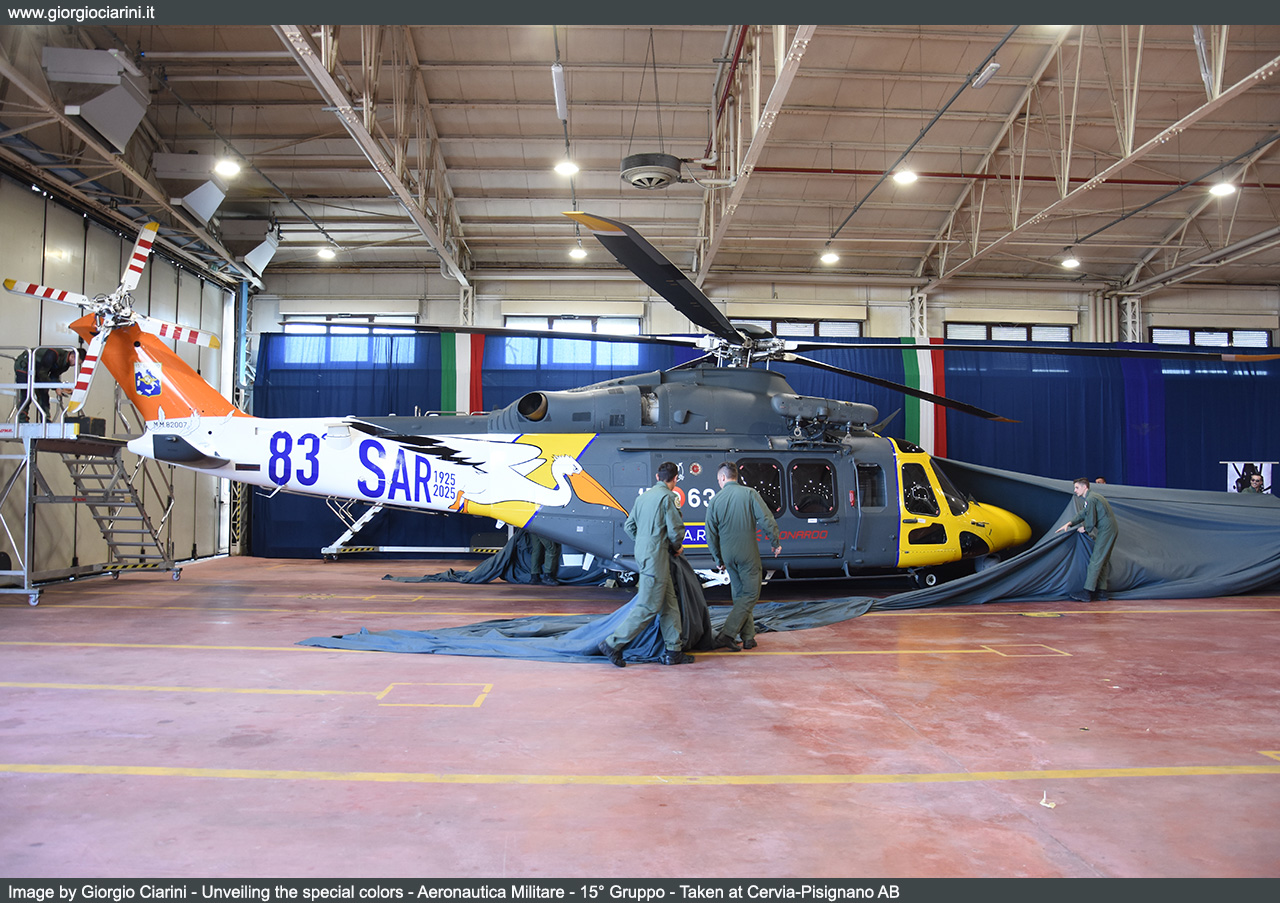 On March 24, a ceremony was held at the Cervia-Pisignano Air Base to mark the centenary of the 83° Gruppo SAR (Search and Rescue – 83rd Squadron SAR). The 83° Gruppo is one of five Gruppi SAR (80° / 82° / 84° / 85°) under the 15° Stormo (15th Wing), which carry out search and rescue operations nationwide. Also under the 15° Stormo is the 81° Gruppo Addestramento Equipaggi (CAE - 81st Crew Training Centre), which is also based in Cervia. The 83° Gruppo was formed on November 5, 1925 in Augusta (Syracuse) and incorporated into the 27° Stormo Idrovolanti - 27th Seaplane Wing (Augusta). The decision to postpone the event by a few months, taking advantage of the spring weather, was amply rewarded by pleasant conditions with clear skies and a light breeze from the nearby Adriatic. The date of March 24 was not chosen at random, but marks exactly the eighty-third day (83rd day) since the unit’s formation on November 5. The ceremony was attended by local institutions, a large number of retired personnel, and an equally substantial number of photographers, enthusiasts and media representatives. The celebration began with a speech by the Commander of the 83° Gruppo, Major Simone Agostinelli, who addressed a message of greeting to the representatives of the institutions and to all those present. He was followed by the Gruppo’s senior commander, Colonel (Ret.) Ruggero Leonetti, who in his speech highlighted the Unit’s history, having been committed to providing assistance to the population since time immemorial. Colonel Antonio Viola, Commander of the 15° Stormo, then took the floor. He warmly thanked all those present and highlighted how the Stormo has constantly adapted to evolving operational scenarios and to technological innovations in equipment and training. He extended equally warm thanks to the Gruppo Commander and his staff for their ongoing commitment in this particular area. The final speaker was Air Division General Alessandro De Lorenzo (Commander of the Comando Forze per la Mobilità e il Supporto - Mobility and Support Forces Command), to which the 15° Stormo reports, who emphasised the importance of air rescue, particularly when our territory is severely affected by major weather events, such as the 2023 Emilia Romagna floods, where the Stormo and its crews rescued more than 300 people in imminent danger of losing their lives. The most moving part, which touched everyone present, was the laying of a colourful floral tribute at the foot of the Stormo’s war memorial, which immediately brought to mind the accident of October 23, 2008, when an HH-3F helicopter, having taken off from Rimini (home to the 83° Gruppo until 2010) and bound for Florennes (Belgium), crashed near Strasbourg (France), causing the deaths of all eight crew members. Following the laying of the floral tribute, the Military Chaplain gave a lengthy speech on the nature of the actions that shape every person’s life. Once the commemorative ceremony had concluded, the guests were invited back to the hangar for the unveiling of an HH-139B helicopter featuring a commemorative livery specially created to mark the unit’s centenary. The aircraft with registration number 15-63 MM82007 has been partially “wrapped” (a technique involving the application of a thermoformable adhesive film) in a colour scheme that incorporates the quintessential colours of air rescue: white, yellow and “day glow” orange – a colour scheme used in the early years of service on the HH-3F, a livery later changed to the standard NATO grey/green camouflage, more suited to purely military operations, before evolving into the current all-grey scheme. The Centenary logo has been placed on both sides of the tail rotor; the inscription “83° SAR 1925–2025” appears on both sides of the tail boom; on the left side are the insignia of the two Squadriglie (Flights) of the 83° Gruppo, the 141ª and the 147ª; whilst on the right side a large pelican is depicted. The waterbird is an ancient Christian symbol of salvation, selfless love and sacrifice, representing Christ giving his life for humanity. Based on the legend that the mother feeds her young with her own blood, it symbolises the Eucharist (the body and blood given) and the Resurrection. The word “Leonardo” was clearly visible on the helicopter’s doors, as the manufacturer of the helicopter and the financial partner that contributed to its execution. The day continued with a flypast over the airbase by two HH-139B helicopters displaying the Italian flag and that of the 83° Gruppo, both suspended from the winch’s steel cable and held by a rescue worker. The same specially coloured helicopter then carried out a ground search and rescue demonstration, involving the recovery of an injured person on a stretcher and hoisting them on board via the winch. The day concluded with the opportunity to purchase the commemorative patch and lithograph, whilst a special rucksack was distributed to both serving and retired personnel. The ceremony concluded with the Gruppo Commander performing the “traditional cutting” of the cake.