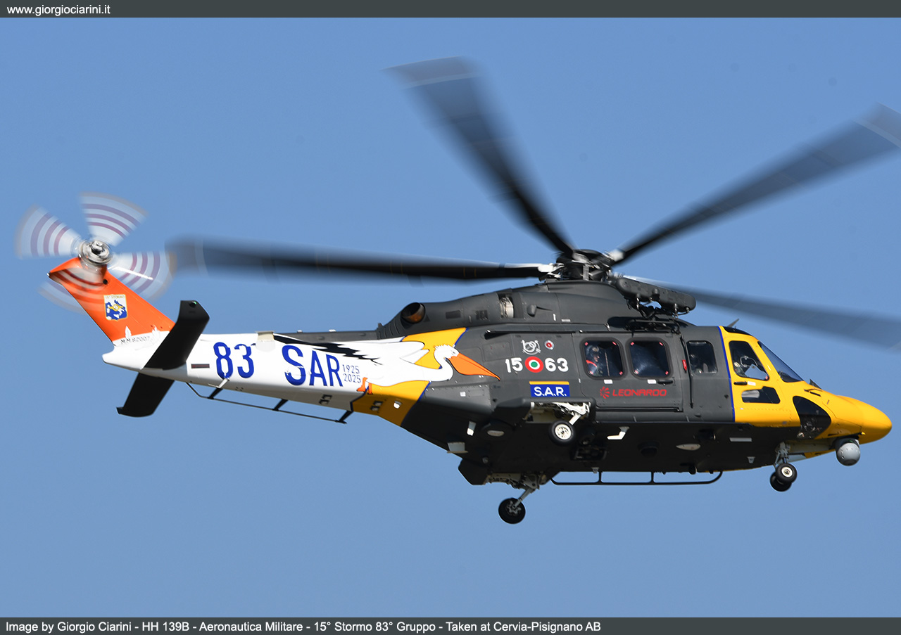 Terminata la parte commemorativa gli ospiti sono stati invitati a raggiungere di nuovo l’hangar per la presentazione di un elicottero HH-139B con una colorazione commemorativa appositamente creata per celebrare i cent’anni del Reparto. L’esemplare codificato 15-63 MM82007 è stato parzialmente “wrappato” (wrapping – tecnica che consente di rivestire il mezzo con una pellicola adesiva termoformabile) con una colorazione che riprende i colori per antonomasia del soccorso aereo, il bianco, il giallo e le “day glow” arancioni, colorazione utilizzata nei primi anni di servizio sugli HH-3F, verniciatura poi trasformata nella mimetica standard NATO grigio/verde, più consona per le operazioni prettamente militari, per poi arrivare a quella attuale mono grigia. Su entrambi i lati della deriva è stato posto il logo del Centenario, su ambedue i lati della trave di coda la scritta 83° SAR 1925 - 2025, sul lato sinistro sono stati collocati gli stemmi delle due Squadriglie dell’83° Gruppo, la 141ª e la 147ª, mentre sul lato destro è stato invece raffigurato un grande Pellicano. L’uccello acquatico esprime un antico simbolo cristiano di soccorso, amore estremo e sacrificio, rappresentante Cristo che dona la vita per l'umanità, basato sulla leggenda che la madre nutra i piccoli col proprio sangue, simboleggia l'Eucaristia (corpo e sangue donati) e la resurrezione. Sui portelloni dell’elicottero era ben visibile la scritta Leonardo, come società produttrice dell’elicottero, nonché partner economico che ha contribuito alla sua realizzazione. |