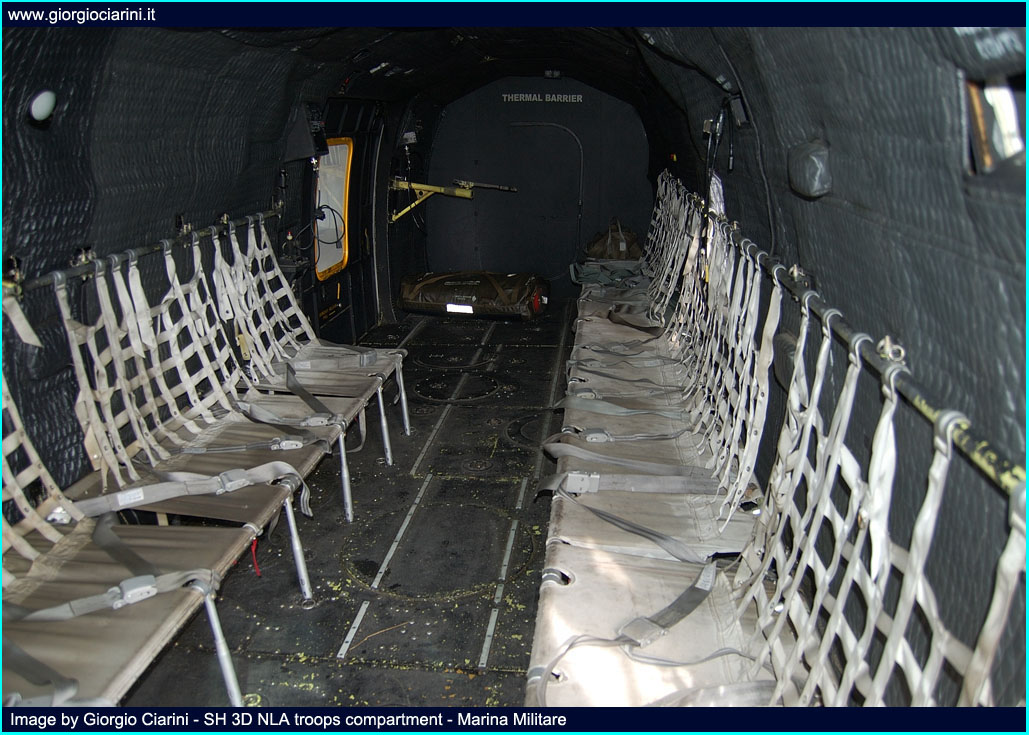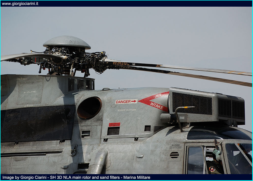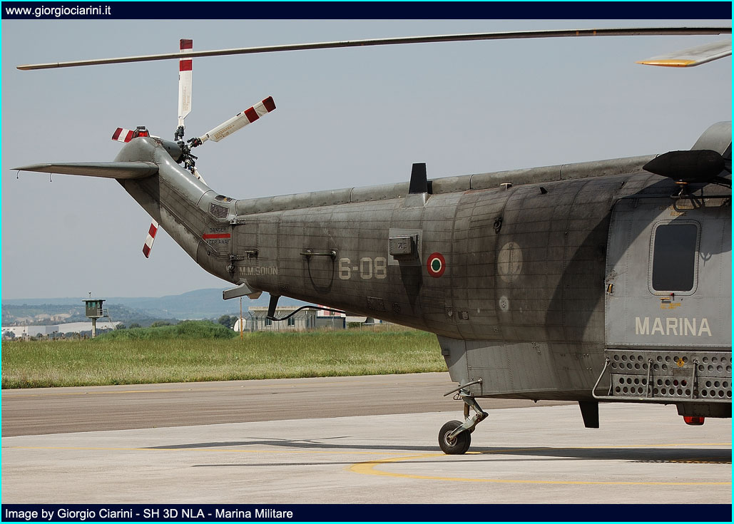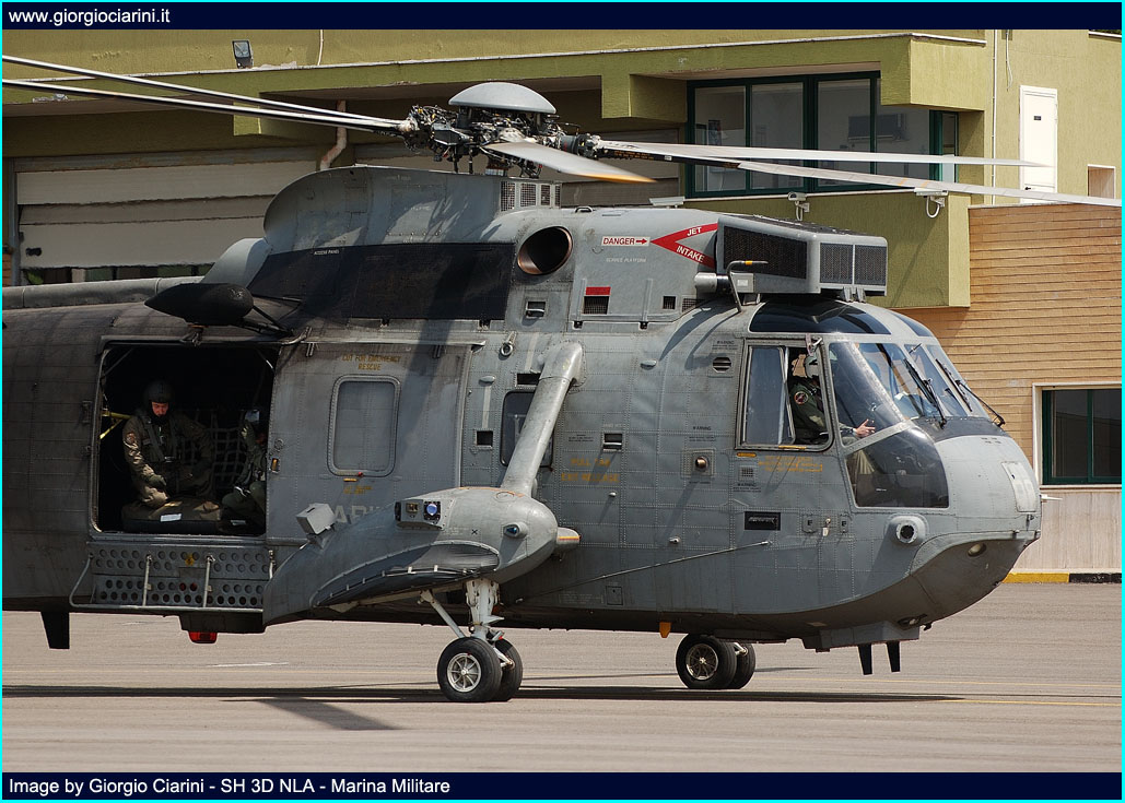The SH-3D Sea King is a medium-heavy twin-engine helicopter developed and built by the American Sikorsky Aircraft Corporation as a natural evolution of the single engine S 62, exclusively designed for naval use made its first flight in 1959 as XHSS-2, later designated HSS-2 entered service in 1961 with the United States Navy, in 1962 the SH 3A designation was changed, starting version for an aircraft that over the years has been updated and modified in many other versions. The helicopter is characterized by a hull-shaped fuselage that allows it to lower and float, also to allow the shelter on ships the Sea King can fold the rotor blades and tail to decrease the surface and length. In Italy the Sea King was built under license by Agusta of Cascina Costa and the version adopted by the Marina Militare was SH 3D standard. The Marina Militare has received 36 originally in the ASW/ASuW version that with the arrival of the substitute EH 101 many examples have been progressively taken out of service, to date the only remaining operational examples are in the version called NLA (Nucleo Lotta Anfibia) used by the Heli-assault unit of the 4° Gruppo Elicotteri of Grottaglie. The SH 3DNLA have been equipped with seats for armored pilots, anti-sand filter to protect the air intakes, internal and external lighting NVG (Night Vision Goggles) and can mount two MG 42/59 branded machine guns. The equipment also includes the Sistema Integrato di Autoprotezione Passivo (SIAP or Integrated Passive Self-protection System) with anti-missile sensors and automatic launching system of false radar targets (chaffs) and IR (flares). The helicopter is able to carry 16 operators of the San Marco Reggimento (Regiment) or Special Forces.