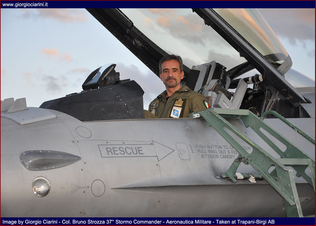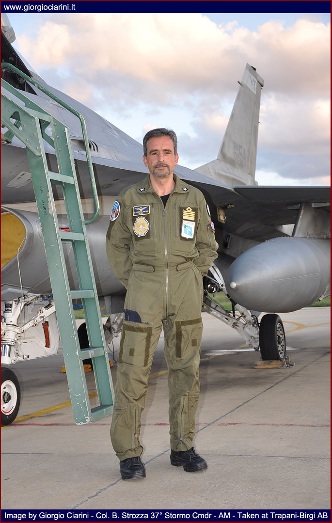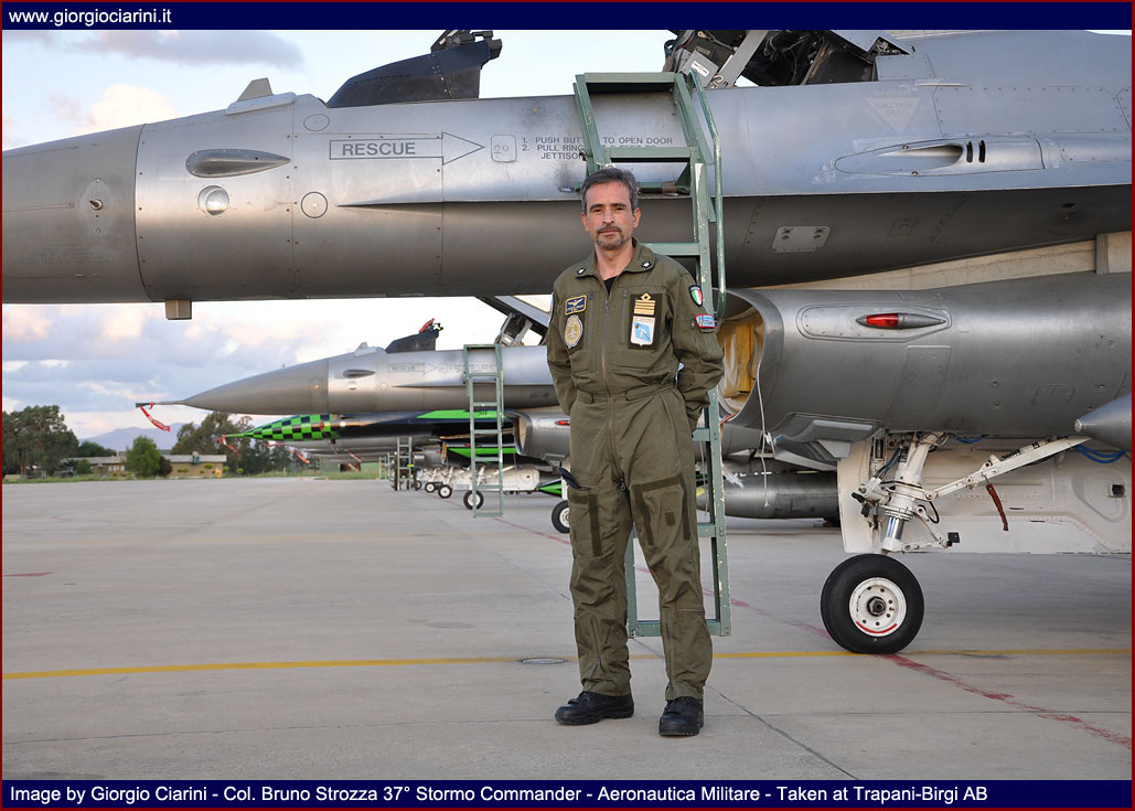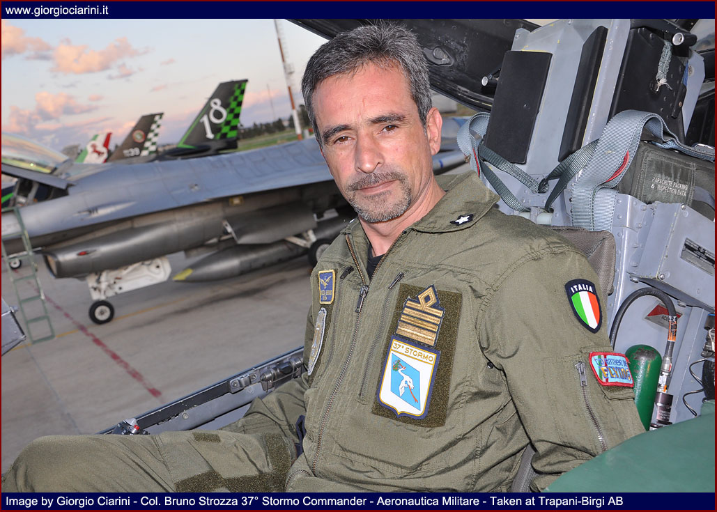 The present Comandante of the 37° Stormo is Colonnello Bruno Strozza, who has held this role from 9 July 2009. Strozza was born at Mondragone (Caserta) on 26 November 1964; after being awarded a diploma in sciences, he entered the Accademia Aeronautica in 1983 as a participant in the Drago IV course. At the conclusion of his permanence at the Accademia the new Sotto Tenente gained his Brevetto di Pilota Militare on the Aermacchi MB 339A aircraft, and subsequently, in 1989, joined the 20° Gruppo of the 4° Stormo to undergo operational conversion onto the TF 104G Starfighter, used by the unit to prepare Italian pilots for service with the Starfighter fleet. In 1990 he was posted to the 9° Stormo at Grazzanise in the province of Caserta, where he has spent the greater part of his operational career flying for a long time with the “famosissimo” 10° Gruppo “Francesco Baracca”. Within the X Gruppo, he has performed a variety of duties: Capo Nucleo Operazioni (Chief of the Operations Cell), Comandante of the 84^, 85^ and 91^ Squadriglia, Capo Sezione Operazioni (Chief of the Operations Section), Capo Ufficio Operazioni (Chief of the Operations Office), and finally arrived at the apex of the staffing structure of a Gruppo di Volo on becoming the Comandante, a role which he performed for four years between 2000 and 2004. In this long period spent at Grazzanise Strozza participated in all the operations conducted on behalf of NATO in the former Jugoslavia and in Kosovo, undertaking mission which were successful in bringing peace to the Balkans. His post-9° Stormo career saw him pass through the 7° Corso Superiore of the Stato Maggiore Interforze in 2004, while in 2005 he was appointed Comandante of the 1° Comando Corso, a course which was undertaken at the Scuola Guerra Aerea in Firenze; after this he served, in sequence, as Comandante Direttore of the 1^ Direzione Corsi of the Istituto Superiore di Scienze Militari Aeronautiche in Firenze, and Comandante of the Reparto Servizi Tecnici Generali of the Istituto Superiore di Scienze Militari Aeronautiche. In his long career the Colonnello has been awarded the following honours: the medaglia militare aeronautica di lunga navigazione aerea, the NATO medal for operations over the former Jugoslavia; the NATO medal for service in the Kosovo operations; the bronze medal for fighter combat operations. Furthermore, as common to all senior officers of the Aeronautica Militare, Strozza has achieved a degree in Aeronautical Sciences from the Accademia Aeronautica at Pozzuoli (Napoli). The Comandante has flown more than 2,600 hours, principally on jet aircraft, and is qualified as an Istruttore di Specialità – role instructor. The majority of these flying hours were undertaken in the MB 339A and CD, in the mythical “Starfighter”, and in the F 16 in its various versions.