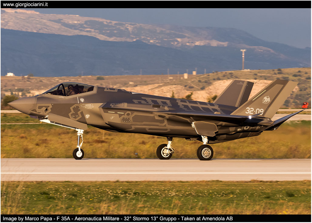Breve cenno sulla base aerea di Amendola L’Aeroporto di Amendola (ICAO: LIBA) — sede del 32° Stormo - è situato nel nord della Puglia, a 15 km a nord est della città di Foggia, appunto nella frazione di Amendola, compresa tra San Giovanni Rotondo e Manfredonia dalla quale l'aeroporto dista 25 km. La struttura, intitolata alla memoria del Tenente pilota Luigi Rovelli, Medaglia d'Oro al Valore Militare, è dotata di una pista in asfalto lunga 2.720 mt. Con la sua ampiezza di 1.050 ettari è l'aeroporto militare più grande d'Italia. All’interno della base aerea operano i seguenti gruppi facenti parte del 32° Stormo: 13º Gruppo Volo - opera con il velivolo di 5^ generazione F 35A JSF (Joint Strike Fighter). 28º Gruppo Volo APR - dotato di aeromobili MQ9-A (Predator “B”) e MQ1-C (Predator “A+”) 632^ Squadriglia Collegamenti - dotata di velivoli MB 339A o CD