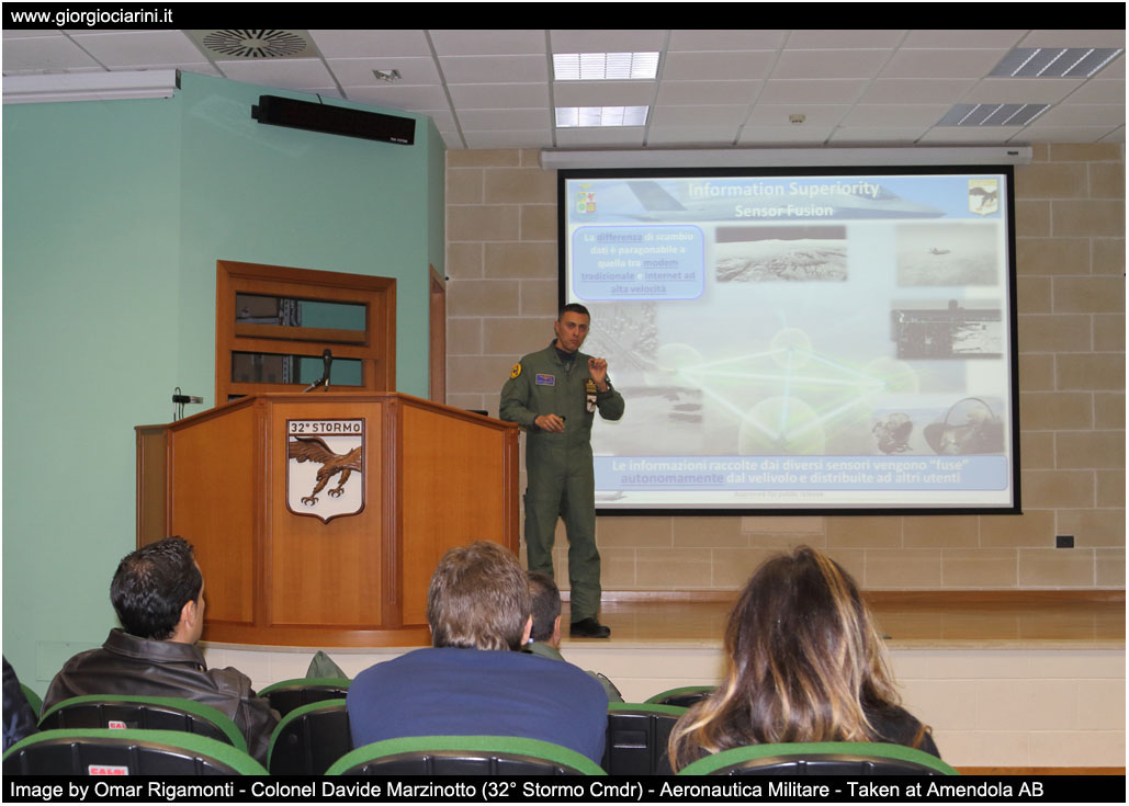 Media Day - Venerdì 30 novembre 2018 Puntuali come da programma, il ritrovo (per un piccolo gruppo ristretto di giornalisti e fotografi) è stato fissato davanti all’ingresso della base aera alle ore 9.00. Successivamente siamo stati tutti trasferiti presso l’aula briefing dello Stormo per l’inizio della conferenza stampa, iniziato con un breve corso sulla sicurezza dell’aeroporto e le misure da adottare all’interno di esso. Alle ore 10, con l’arrivo in base a bordo di un UH 139A del 31° Stormo del Capo di Stato Maggiore dell’Aeronautica, il Generale di Squadra Aerea Alberto Rosso, e dopo gli onori e i saluti al Capo di SMA ad opera del moderatore Col. Merola, la parola è passata al Comandante del 32° Stormo, il Col. Davide Marzinotto che ha presentato in maniera molto dettagliata la base aerea di Amendola con un focus particolare sull’F 35. Alle 10.50 ha preso parola il Col. Andres Maldonado che ha descritto brevemente le funzionalità della TLP e gli assetti che vi operano nel corso di questa edizione. Durante la FC 2018-4 il numero di Aircrew partecipanti è di 28 equipaggi che si alternano nel corso delle quattro settimane tra Blue Assets (28 equipaggi) e Red Assets (12 equipaggi) e otto Support Assets con compiti di AEW, EW, SLOMO, SURPIC, HVAA e CSAR. In quattro settimane (20 giorni) 15 sono stati i giorni operativi con operazioni di volo reali, mentre altri cinque per la pianificazione e relativi feed-back. Alle 11.30 a conclusione della conferenza stampa siamo stati trasferiti presso l’area del 13° Gruppo Volo dove per l’occasione è stata predisposta una mostra statica di alcuni dei velivoli partecipanti al TLP con la possibilità di interviste ai testimonial individuati. Erano presenti alla mostra statica un F 35A (32-07), un G 550CAEW, un T 346A, un F 2000A Typhoon, un MQ9-A per l’Aeronautica Militare, un AV 8B della Marina Militare, un F 16AM belga, un Tornado ed un EF 2000 della Luftwaffe, un Bombardier Learjet 36A ed un F 15C dell’USAF di Lakenhealt. Alle ore 12.00 c’è stato un “Media Opportunity” con il Capo di Stato Maggiore dell’Aeronautica Militare sempre presso l’area del 13° Gruppo Volo. Durante tale evento il CSM ha dichiarato la Initial Operational Capability (IOC) dell’F 35A dell’Aeronautica Militare, prima Forza Aerea europea a raggiungere questo ambito traguardo. “Oggi è una giornata importante per l’Aeronautica Militare, con il conseguimento formale della Initial Operational Capability dei nostri F 35 siamo in grado di esprimere (i primi in Europa) una capacità operativa reale con una macchina di 5^ Generazione, che vuol dire essere pronti ad affrontare le missioni richieste dal sistema di difesa nazionale con un sistema costituito da più velivoli, da equipaggi pronti ed addestrati ad impiegarli, supportati da personale manutentivo e logistico sostenibile nel tempo. Dobbiamo essere orgogliosi di questo traguardo, raggiunto grazie al lavoro di chi ci ha preceduto e di chi ogni giorno con impegno, cuore e passione ha permesso di raggiungere risultati incredibili. Un giorno molto importante anche per il significato di questo Corso TLP, che rappresenta la prima concreta integrazione tra sistemi d’arma legacy di 4^ e 5^ Generazione ed una importante opportunità per crescere e sviluppare insieme ad altre nazioni amiche le capacità essenziali che il potere aero-spaziale deve essere in grado di esprimere a livello internazionale. L’F 35 ha una flessibilità di impego elevatissima in grado di ricevere e ridistribuire un flusso straordinario di dati essenziali ed è quanto di meglio c’è al mondo e noi (come AM) ci siamo e siamo da oggi pronti”. |