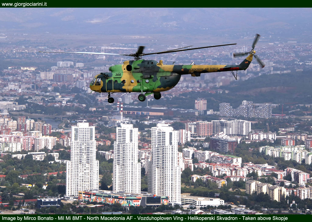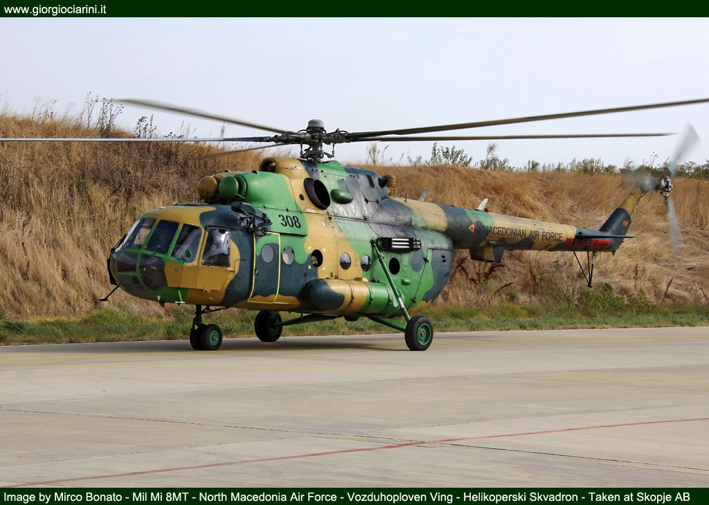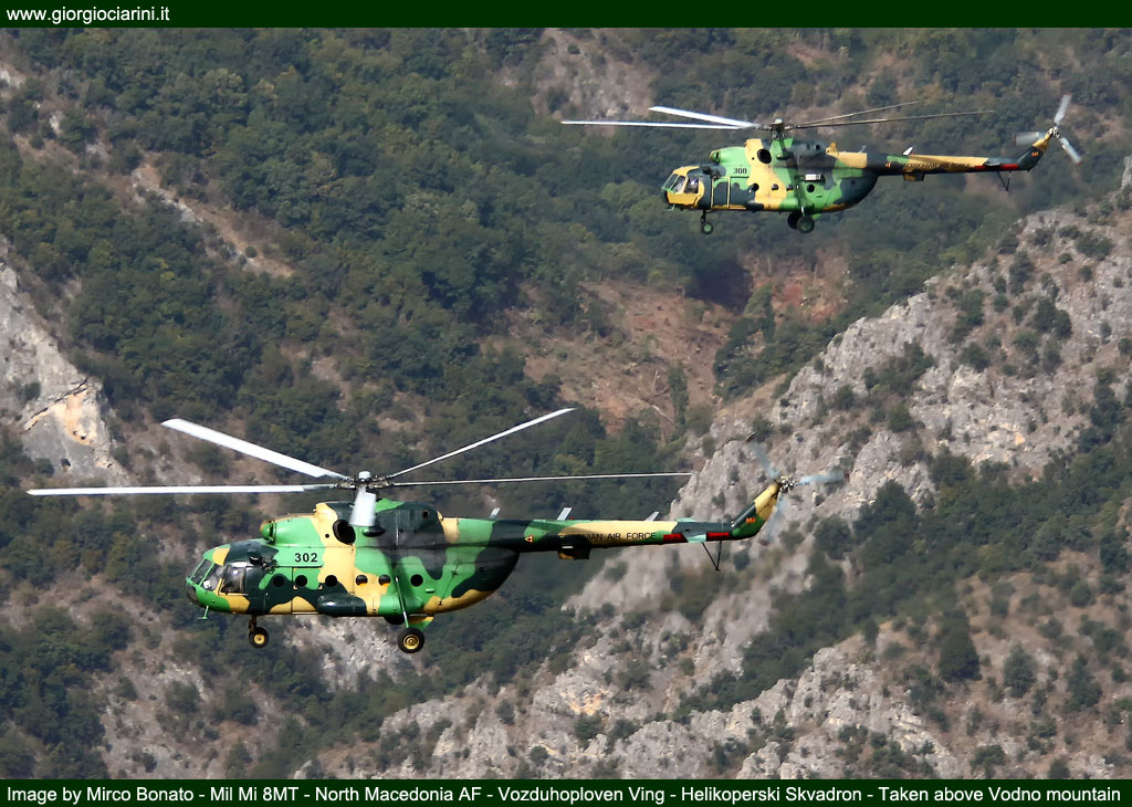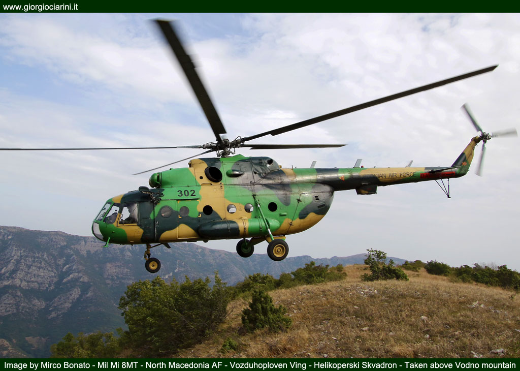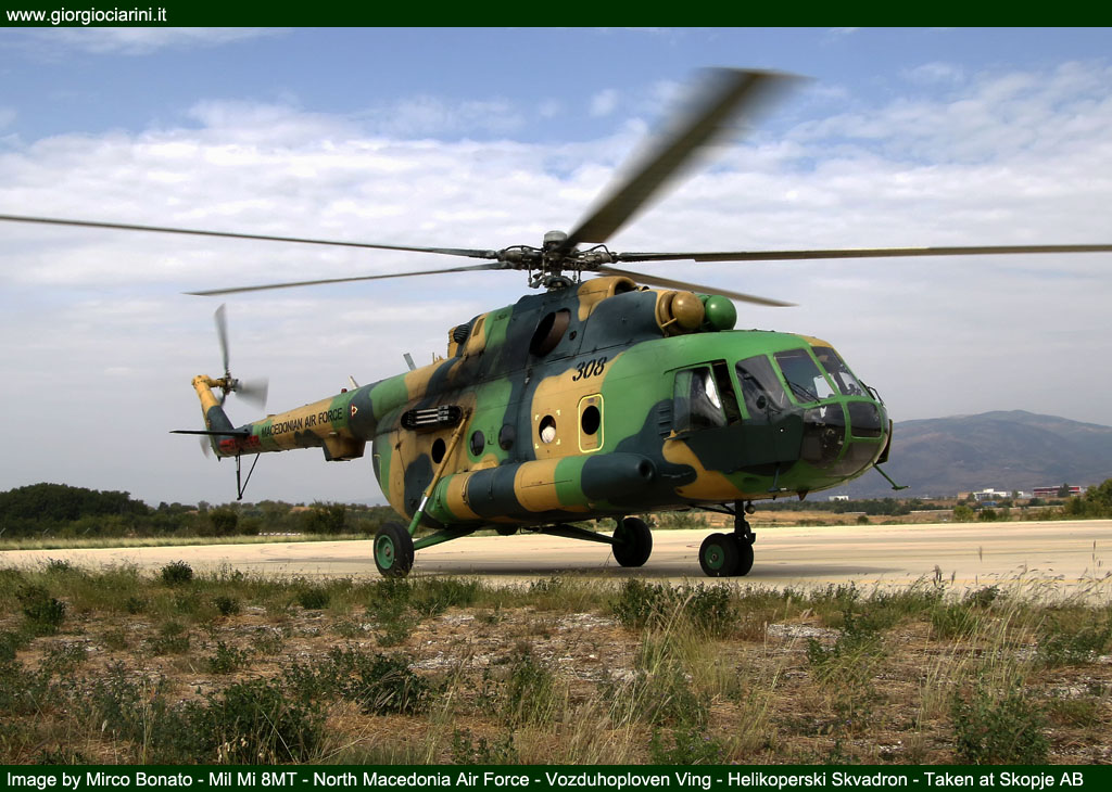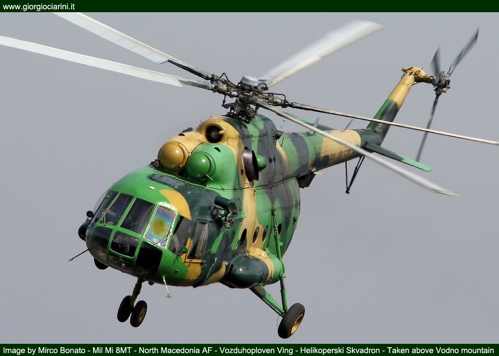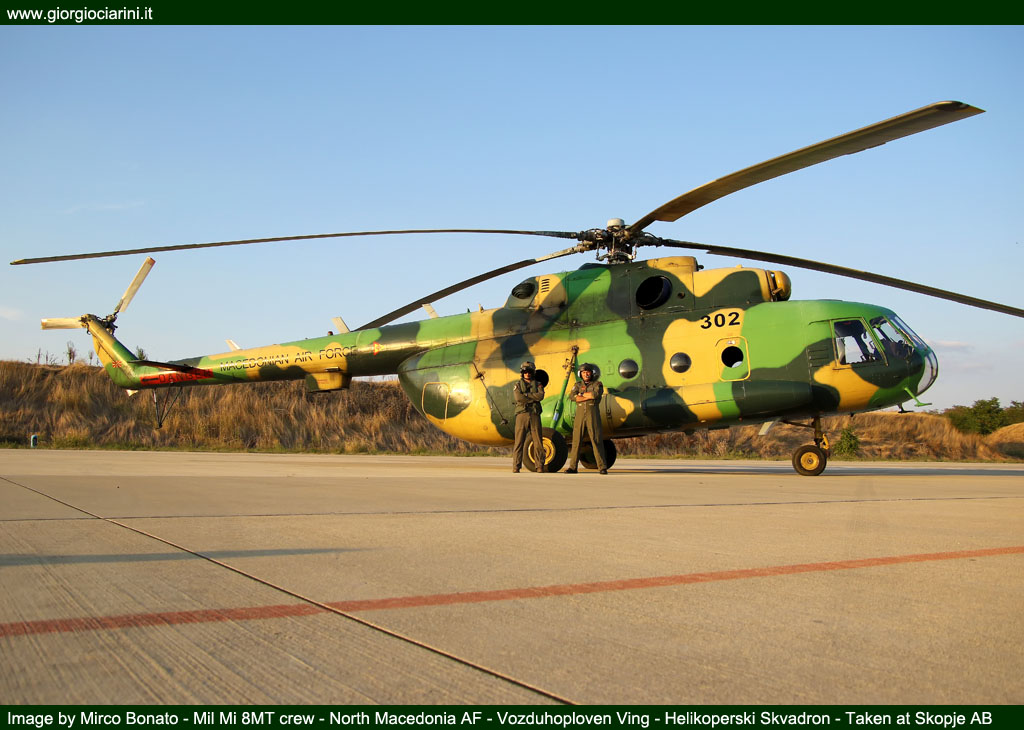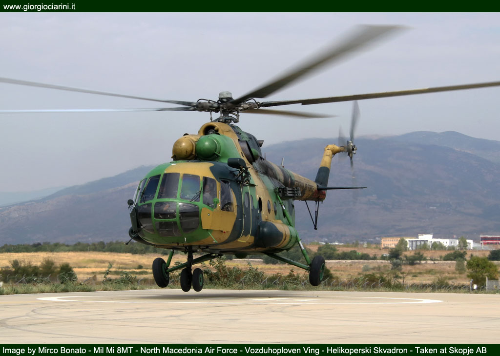 | Dopo un estensione della vita operativa dei Mi-24 nel 2016 che li ha portati a volare fino all'inizio del 2021, i Mi-24 sono stati definitivamente messi a terra ed oggi la Macedonia del Nord conta solo sulla Squadriglia di Mi-8 e Mi-17. Nel 2003 venne applicato un programma di upgrade eseguito dalla Elbit su due Mi-17 e due Mi-24 con l'introduzione dell'Aviators Night Vision Head-Up Display (ANVIS/HUD-24) mentre nel 2005 altri due Mi-24, due Mi-8MT e due Mi-17 vennero sottoposti ad un ulteriore programma della Elbit con l'installazione di ANVIS/HUD-24, apparati ILS e VOR/DME, IFF, comunicazioni migliorate e capacità NVG . Attualmente vi sono in servizio quattro Mi-8MT e due Mi-17 che svolgono i compiti SAR, anti-incendio, Medevac, trasporto e supporto alle forze speciali. Come ci spiega il Magg. Dusko Stevoski, pilota di Mi-24, “il Mi-8 è molto robusto e sicuro, in grado di volare ad alte temperature sopra gli incendi e dispone di un motore potente ed affidabile, ed in grado di volare ad alta quota. Le nostre montagne arrivano a 2.700 mt come il monte Korab dove è particolarmente impegnativo atterrare e decollare e vi andiamo ogni due settimana a dare il cambio ai soldati li di guardia”. Dall'ultimo programma di revisione, i Mi-8 e Mi-17 hanno avuto un estensione della vita operativa per altri sette anni oppure 1.500 ore di volo. |