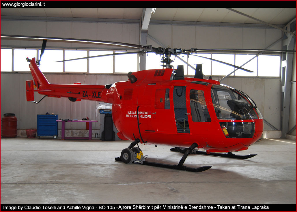 Oltre agli elicotteri ricevuti dall’Esercito Italiano la FASH ha in carico sei Bolkow BO 105, surplus delle Forze Armate tedesche, sono stati consegnati in Albania nel 2006, questi velivoli saranno portati alla configurazione della versione E4, sempre l’Eurocopter Deutschland dovrà integrare sistemi di missione opzionali comprendenti sistemi EMS (Emergency Medical Services), apparati SAR (Search and Rescue) ed allestimenti per il trasporto VIP e oltre all’aggiornamento delle macchine Eurocopter provvederà anche ad addestrare i piloti. Al Reggimento Elicotteri è affidato anche un Agusta A 109C per il trasporto VIP e per il trasporto presidenziale Il totale di questi elicotteri consegnati dai tedeschi è di 12 esemplari, di cui sei come già detto in dotazione alla Forza Aerea, mentre quattro sono stati consegnati alla Polizia e due al Ministero degli Interni (Ajrore Shërbimit për Ministrinë e Brendshme), oltre ai Bolkow, questo dicastero ha in dotazione anche tre Alouette III. La base operativa del distaccamento elicotteri del Ministero degli Interni è un piccolo eliporto all’interno della Capitale Tirana e viene condiviso con il servizio aereo della Polizia, servizio che può contare oltre ai Bo 105 anche a due AS 350 Ecureuil ed a un grosso bimotore Mil Mi 8 (Ex Hungarian AF) che però non può operare per le dimensioni del piccolo eliporto affogato fra grandi e moderne costruzioni da dove invece possono operare facilmente gli altri elicotteri. |