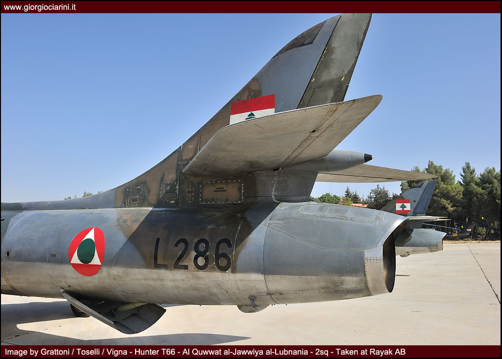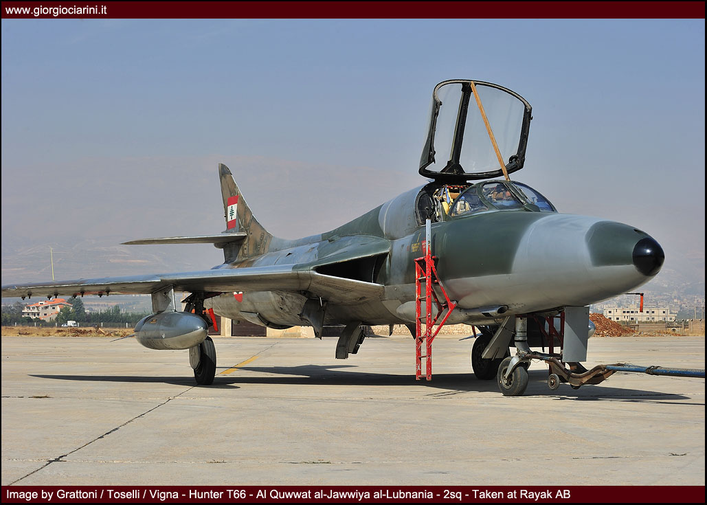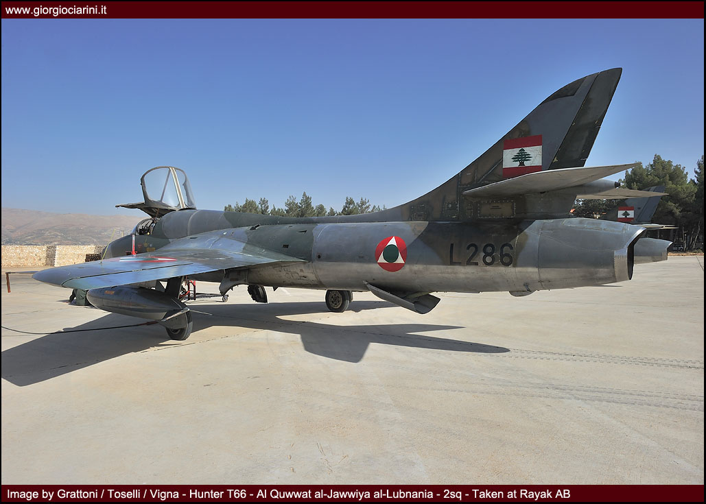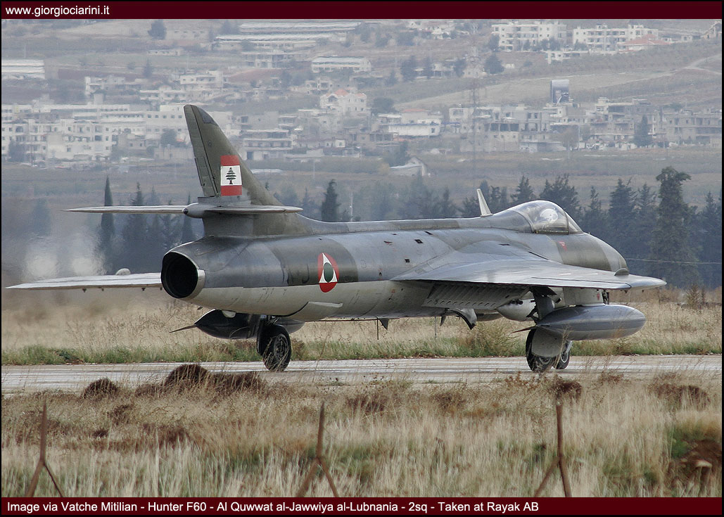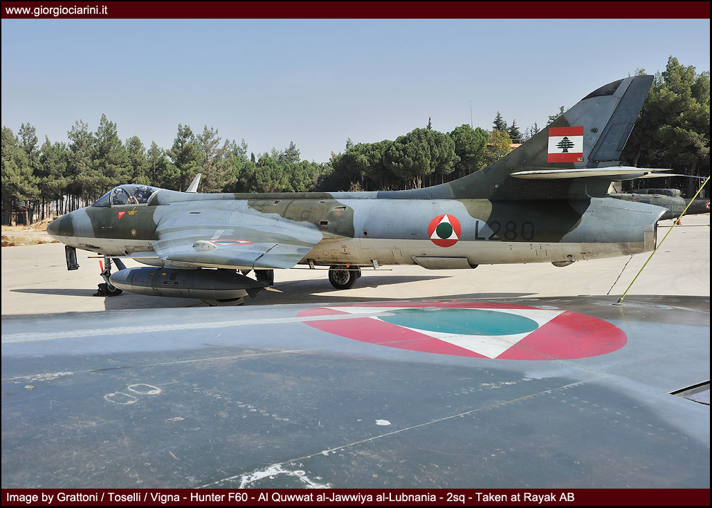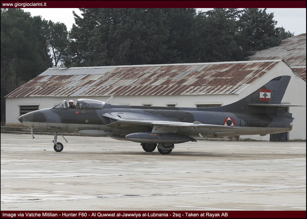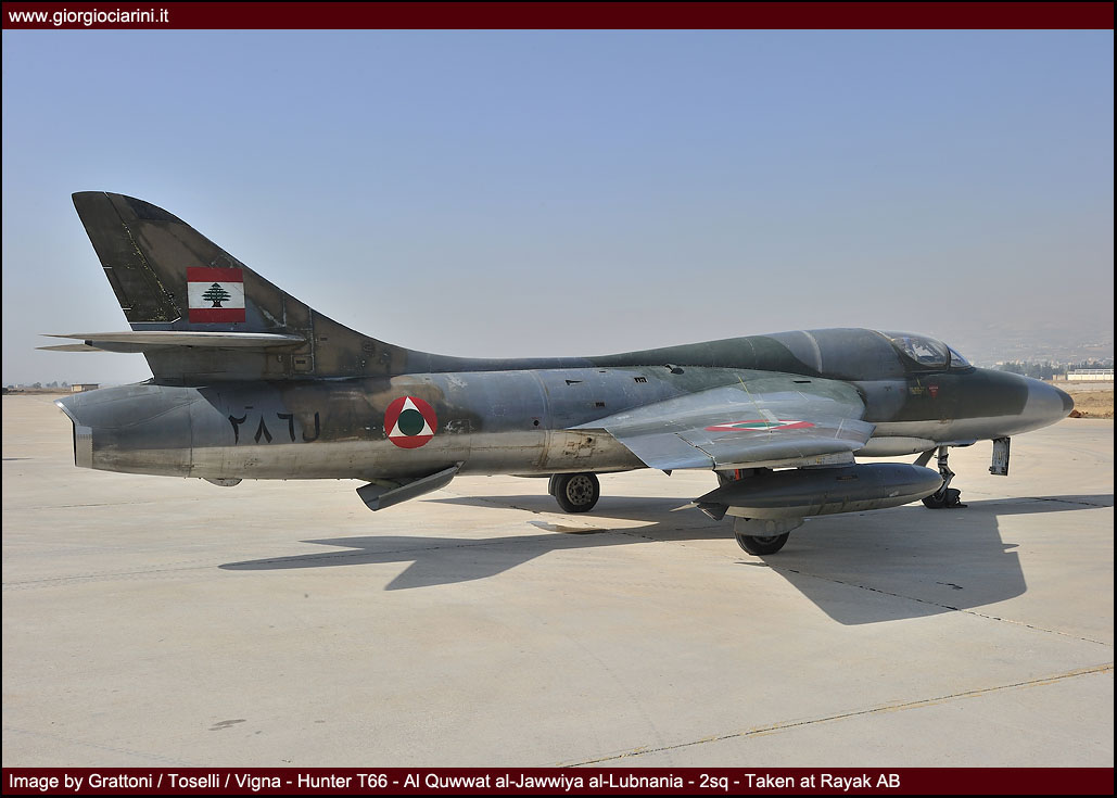 L’ottimo Hunter rappresenterà il più longevo ed anche il più amato aereo da combattimento entrato in servizio nella LAF, utilizzato intensamente in missioni di attacco al suolo nel 1973, 1976, 1983 e 1984 si trovò anche ad impegnare in combattimenti aria-aria i jet israeliani abbattendone uno. Per gli eventi bellici degli anni ’83-90 venne rischierato su quella che venne definita la base di Halat, una striscia autostradale a nord della capitale nei pressi di Byblos, assieme a Bulldog e Magister, dove mezzi e personale riuscirono a dimostrare grandi doti di flessibilità ed operatività. Perdite ed incidenti di volo (l’ultimo si verificò nel 1989) comportarono una riduzione considerevole del numero degli esemplari in linea, così nel 1994 dopo un inconveniente in decollo ad un biposto i superstiti otto Hunter vennero accantonati e conservati presso la base di Rayak. Nonostante la non giovane età e la penuria dei pezzi di ricambio, il buon Hunter fece di necessità virtù riapparendo nel novembre 2008 nelle linee di volo sulla spinta degli avvenimenti bellici: oggi sono solo quattro gli esemplari operativi di base a Rayak, tre F.70 (L-280, L-282, L-284) ed 1 T.66 (L-286), facendo così della FAL l’ultima Forza Aerea a far volare ancora questo stupendo aeroplano.