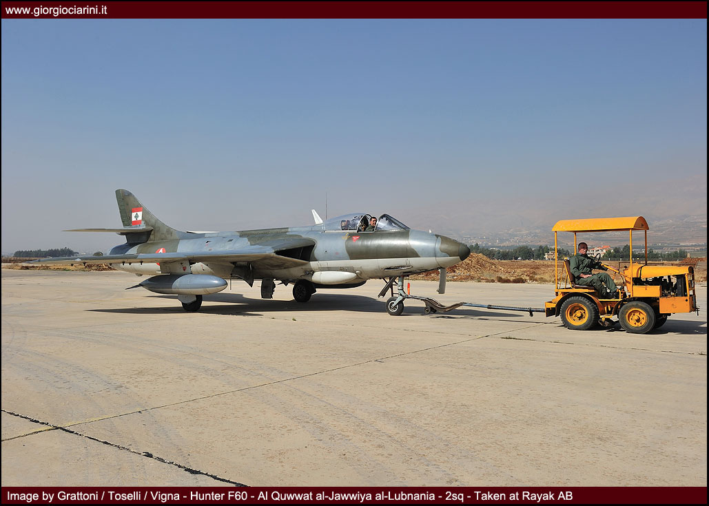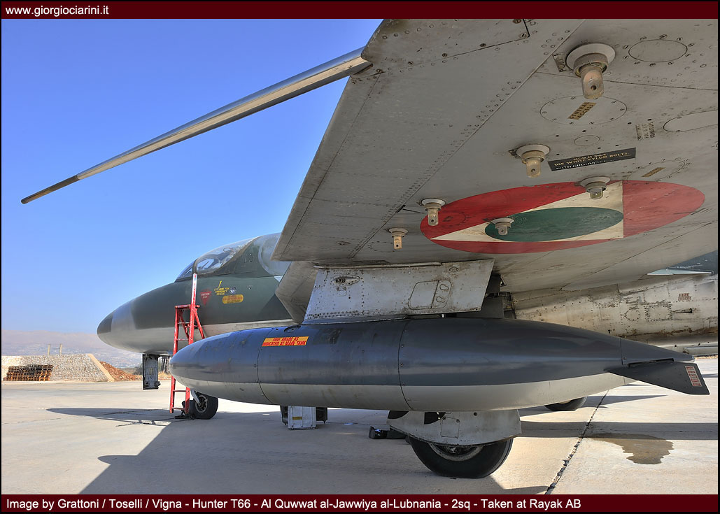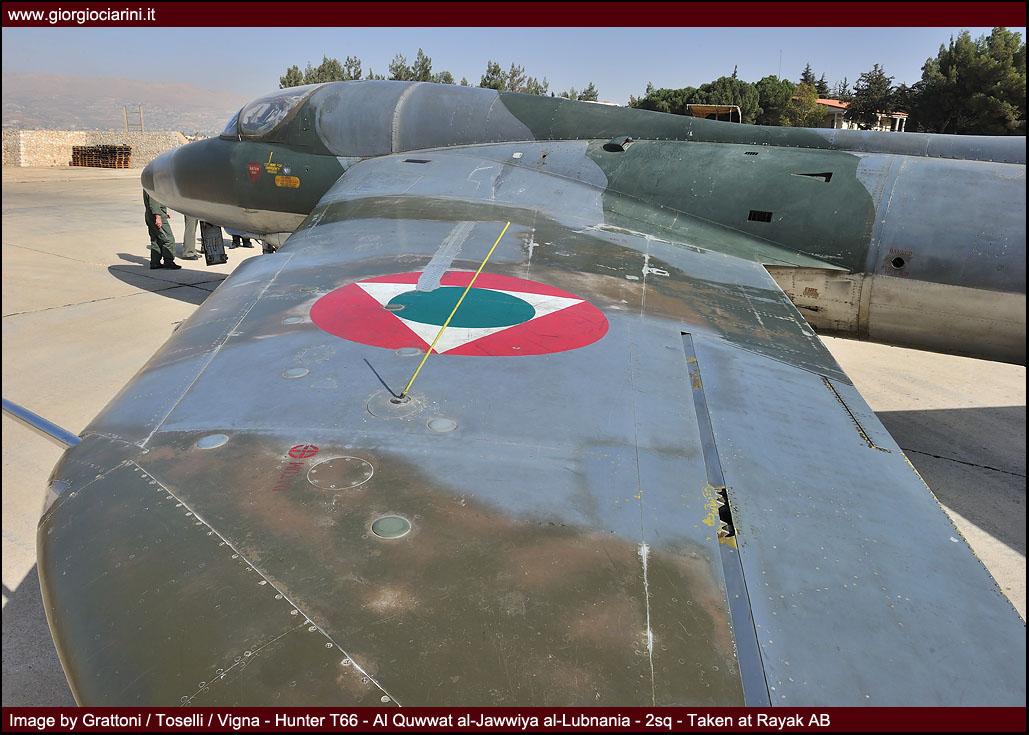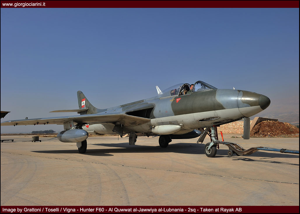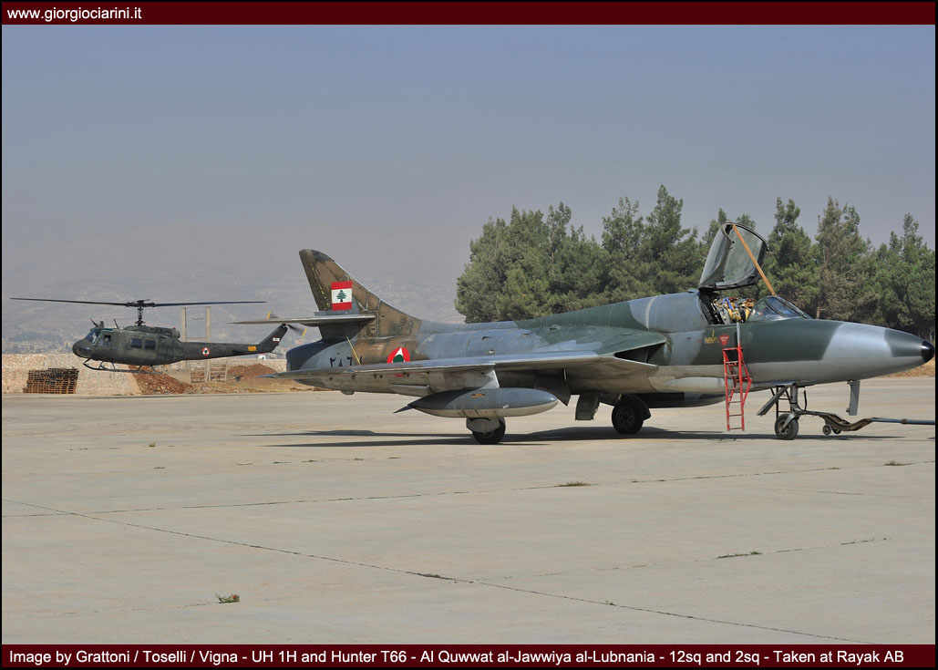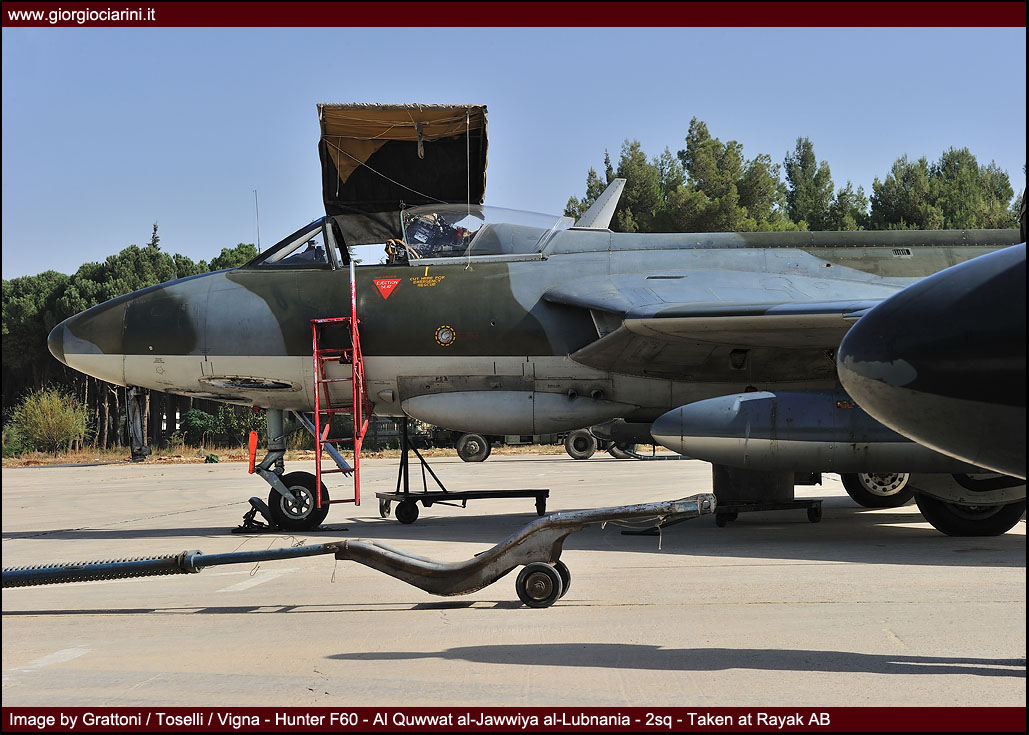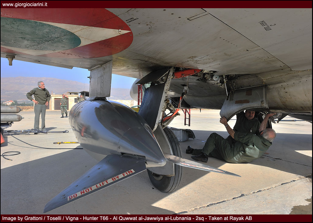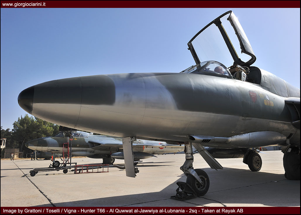 L’ottimo Hunter rappresenterà il più longevo ed anche il più amato aereo da combattimento entrato in servizio nella LAF, utilizzato intensamente in missioni di attacco al suolo nel 1973, 1976, 1983 e 1984 si trovò anche ad impegnare in combattimenti aria-aria i jet israeliani abbattendone uno. Per gli eventi bellici degli anni ’83-90 venne rischierato su quella che venne definita la base di Halat, una striscia autostradale a nord della capitale nei pressi di Byblos, assieme a Bulldog e Magister, dove mezzi e personale riuscirono a dimostrare grandi doti di flessibilità ed operatività. Perdite ed incidenti di volo (l’ultimo si verificò nel 1989) comportarono una riduzione considerevole del numero degli esemplari in linea, così nel 1994 dopo un inconveniente in decollo ad un biposto i superstiti otto Hunter vennero accantonati e conservati presso la base di Rayak. Nonostante la non giovane età e la penuria dei pezzi di ricambio, il buon Hunter fece di necessità virtù riapparendo nel novembre 2008 nelle linee di volo sulla spinta degli avvenimenti bellici: oggi sono solo quattro gli esemplari operativi di base a Rayak, tre F.70 (L-280, L-282, L-284) ed 1 T.66 (L-286), facendo così della FAL l’ultima Forza Aerea a far volare ancora questo stupendo aeroplano.