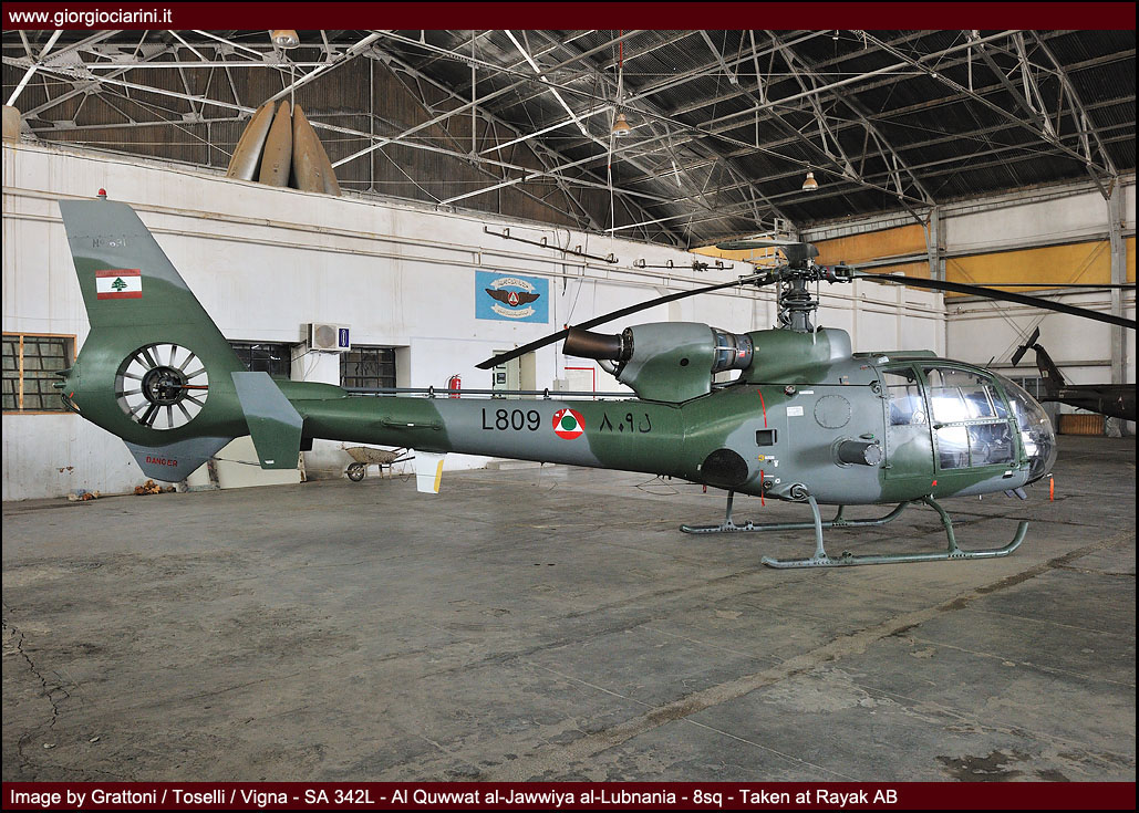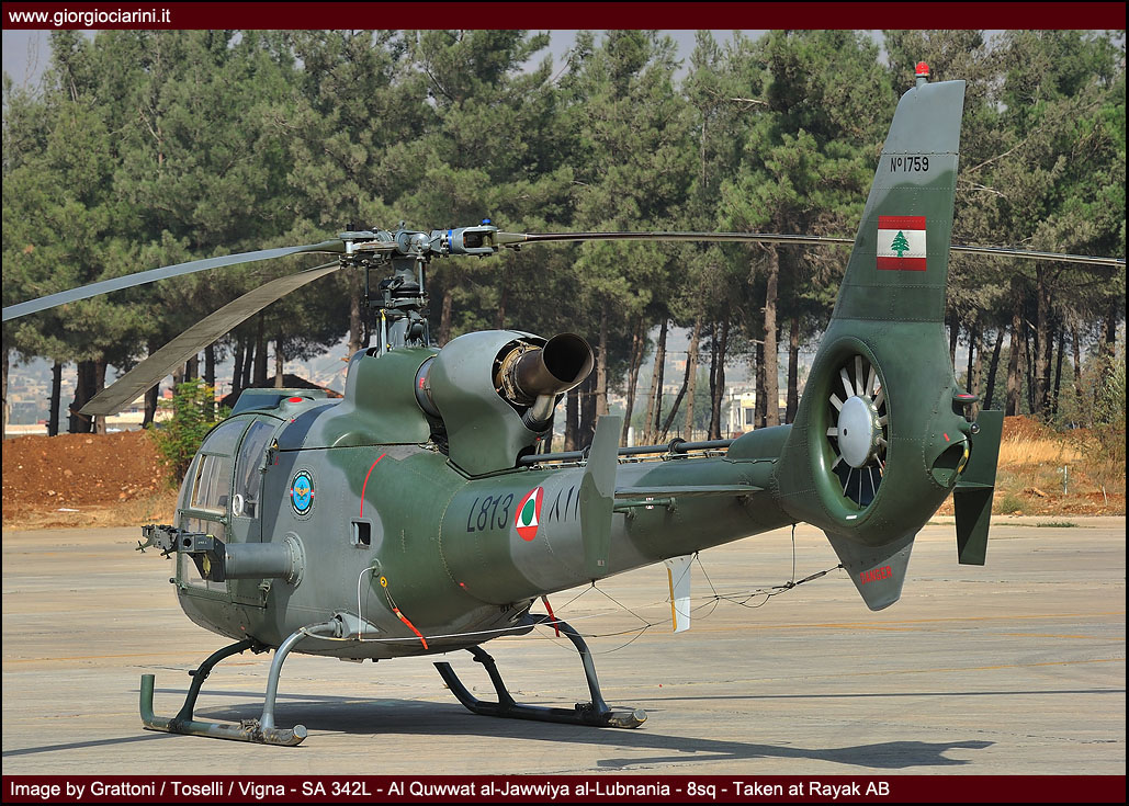 Almost simultaneously 8 Squadron was constituted in order to receive the first attack helicopters armed with heavy machine guns or cannon, HOT anti-tank missile, and un-guided rockets: these were four SA-342 Gazelle, followed in 1983 – 1984 by another four of the ‘K’ version (L-800/L-817). The final arrival of nine SA-342, drawn from surplus United Arab Emirate stocks, commenced in March 2007, and they were originally assigned to the fleet of the Squadron in their original desert colour scheme (L-808/L-816).
