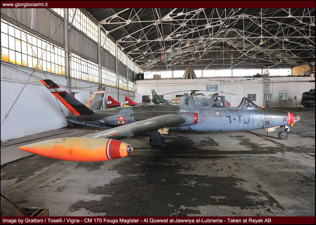 During the sixties, in expectation of the arrival in the future of a jet fighter fleet, the necessity to possess an advanced trainer became apparent. The choice fell on the Fouga Magister CM-170, five of which were delivered in 1966 (L-440/L444, later L-400/L-404), followed in 1972 by others provided from Luftwaffe sources (L-601/L-605). From 1974 the serial range was changed to L-600/L-608. Used actively until the early nineties, today four examples are held in store in a hangar at the Rayak base, in the not too remote possibility that they might be returned to service.