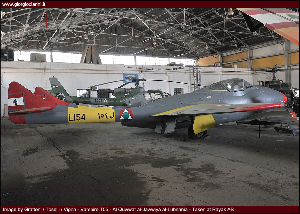 The year 1953 represented the moment of passage to jet aircraft, with the introduction of the first six de Havilland Vampire, which contemporarily required the construction of a second base at Beirut international airport, known today as Khaldeh Air Base. During the following years the Vampire fleet role to sixteen examples (L-150/L-165), comprising 4 FB.5, 5 FB.52 and 3 FB.9, plus 4 two-seat T.55 (L-151, L-154, L-159, L-160); these remained operational until the sixties, while the last two trainer versions were retired at the start of the seventies.