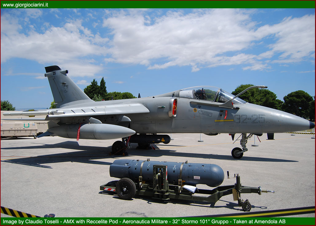 | Per terminare degnamente l’articolo mi sembra doveroso parlare anche della base di Amendola, sede del 32° Stormo (Armando Boetto) è la più grande base aerea in Italia con circa 1.050 ettari di estensione. Con oltre 1200 militari e civili presenti è destinata a ricevere secondo i programmi dello Stato Maggiore nel 2015 i caccia multiruolo di quinta generazione Lockheed Martin F 35 (JSF Joint Strike Fighter). Oltre al già menzionato 28° Gruppo Velivoli Teleguidati, sono basati anche il 13° e 101° Gruppo, dotati entrambi di cacciabombardieri leggeri Alenia AMX, molti di essi sono già convertiti nella versione ACOL, ossia Aggiornamento delle Capacita’ Logistiche ed Operative, e dotata di sistemi di navigazione all’avanguardia nonché capacità di volo notturno attraverso l’impiego di apparati NVG (Night Vision Goggles) utilizzati a corredo del casco in dotazione del pilota. Inoltre recentemente è entrato in servizio il nuovo POD da ricognizione Reccelite, costruito dalla israeliana RAFAEL, il Reccelite è in grado di riprendere immagini in qualsiasi ambiente luminoso diurno/notturno, di memorizzarle o di trasmetterle tramite un ROVER in banda C ad una stazione remota, grazie al sistema inerziale GPS è in grado di effettuare le riprese in automatico in base alla missione caricata sulla Mission Plan, oppure naturalmente può essere gestito manualmente dal pilota, grandissimo vantaggio è quello di avere direttamente sull’MFD (Multi Function Display) del cockpit la ripresa in diretta. |