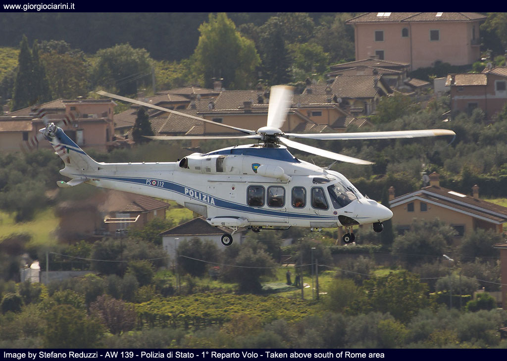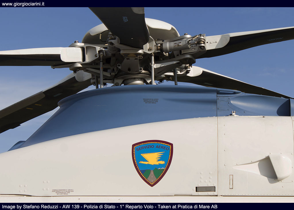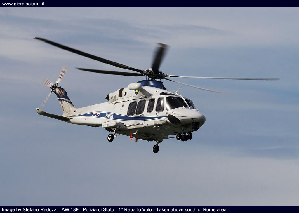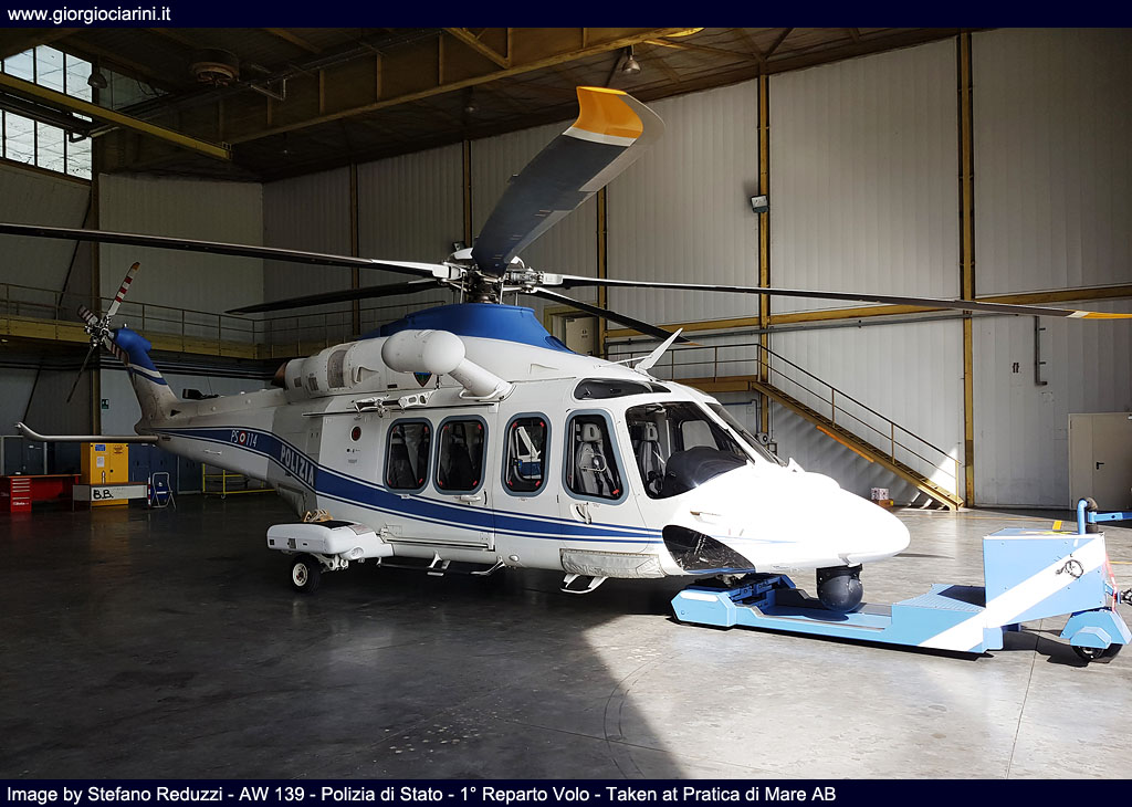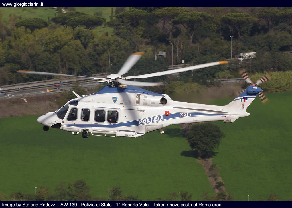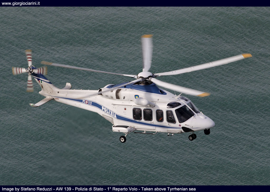 L'AW 139 è un elicottero bi-turbina, polivalente, a 15 posti, prodotto in Italia e negli Stati Uniti d'America. Il velivolo consente un peso max. al decollo pari a 6800-7000 kg grazie all’utilizzo di due turbine Pratt&Whitney PT6C-67C che erogano una potenza di 1.142 kw (1.531 shp) ciascuna, riuscendo a fargli raggiungere una velocità max. 306 km/h (165 kts) con un’autonomia di carburante di 3h e 54’. L’elicottero è stato consegnato nel 2003 nello stabilimento di Vergiate (Varese) dove ha sede l'assemblaggio finale e ad oggi ne sono stati prodotti più di 1.000 esemplari. E’ stato presentato al mercato in diverse configurazioni incluse polizia, eliambulanza, trasporto VIP, SAR (Search and Rescue) e supporto alle piattaforme petrolifere off-shore. I primi elicotteri AW 139 acquistati dalla Polizia di Stato fanno la loro comparsa nel 2012, acquistati anche attraverso i fondi dell’Unione Europea riguardanti il programma FRONTEX (l’agenzia dell’EU per il controllo delle frontiere). Ad oggi la flotta è composta da otto velivoli schierati presso cinque degli 11 Reparti Volo presenti sull’intero territorio nazionale (Pratica di Mare, Fenosu, Bari, Reggio Calabria, Palermo) e di altri due in arrivo nei prossimi mesi, che verranno assegnati ai Reparti Volo di Milano – Malpensa, Venezia e Firenze. La loro entrata in servizio ha portato ad una riorganizzazione interna, sia in termini addestrativi, riguardando il particolare addestramento dei piloti con simulatori FFS (Full Flight Simulator), sia in termini di manutenzione, che ora è demandata principalmente alla ditta produttrice, ma soprattutto in ambiti operativi. L’elevato potenziale di tale velivolo consente infatti alla Polizia di Stato di operare in molteplici e complesse attività come l’ordine pubblico, polizia giudiziaria, controllo del territorio, scorta durante le visite di delegazioni di alte personalità dello Stato, ricerca e soccorso SAR, trasporto sanitario d’urgenza, riprese aero cinefotografiche ed operazioni con corpi speciali della Polizia con maggiore precisione, efficacia, autonomia di carburante e certamente maggior comfort per le persone a bordo. L’equipaggio standard è formato da due piloti (comandante e copilota), e da due operatori di bordo. Uno di questi, in particolare, è addetto al controllo della performante telecamera del velivolo FLIR Star Safire 380 HD che ha una invidiabile portata dello zoom di ben oltre 4 km. Di produzione statunitense e concepita essenzialmente per scopi militari si presta perfettamente, con le sue specifiche caratteristiche (tracking, infrared, ecc.), all’utilizzo durante il servizio di polizia. Le immagini registrate vengono trasmesse direttamente presso le Sale Operative delle Questure richiedenti,così da fornire un formidabile strumento nella complessa gestione delle forze dell’ordine sul campo.