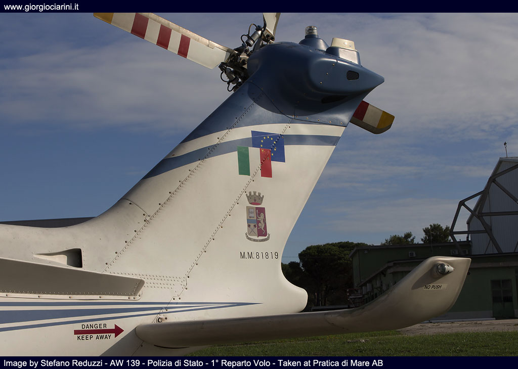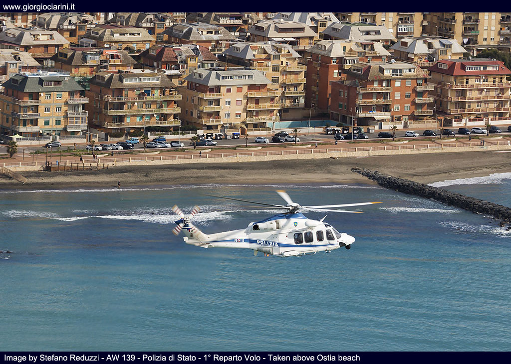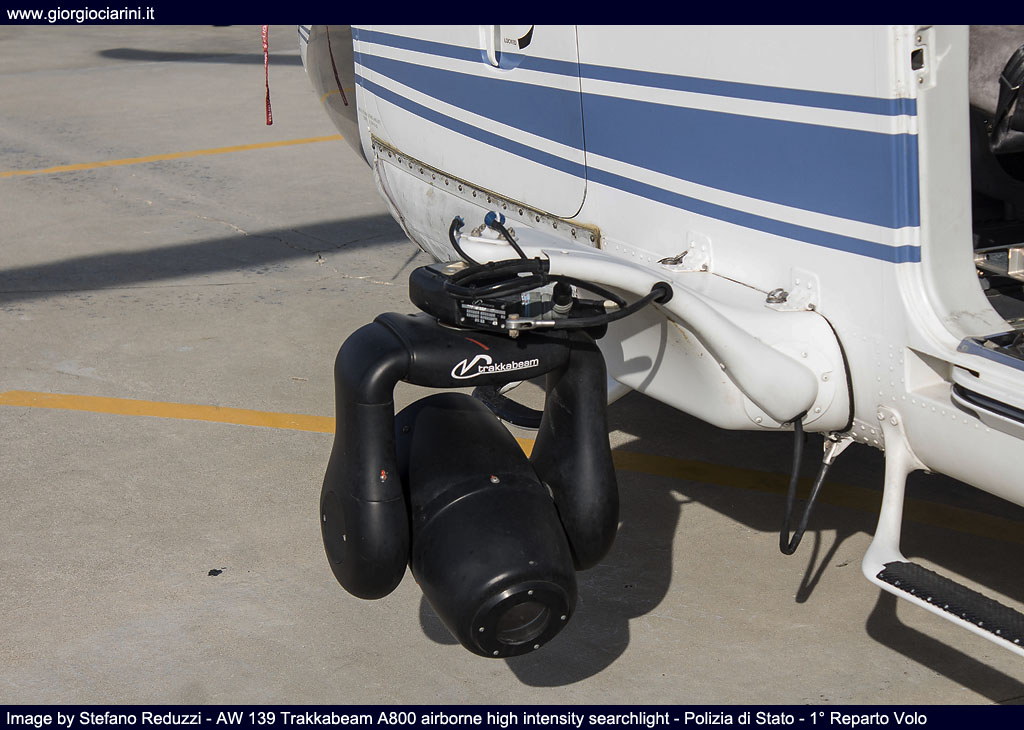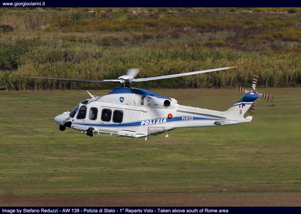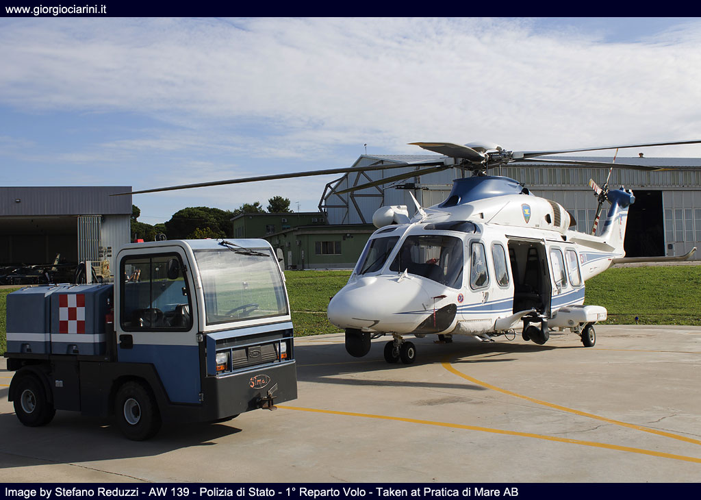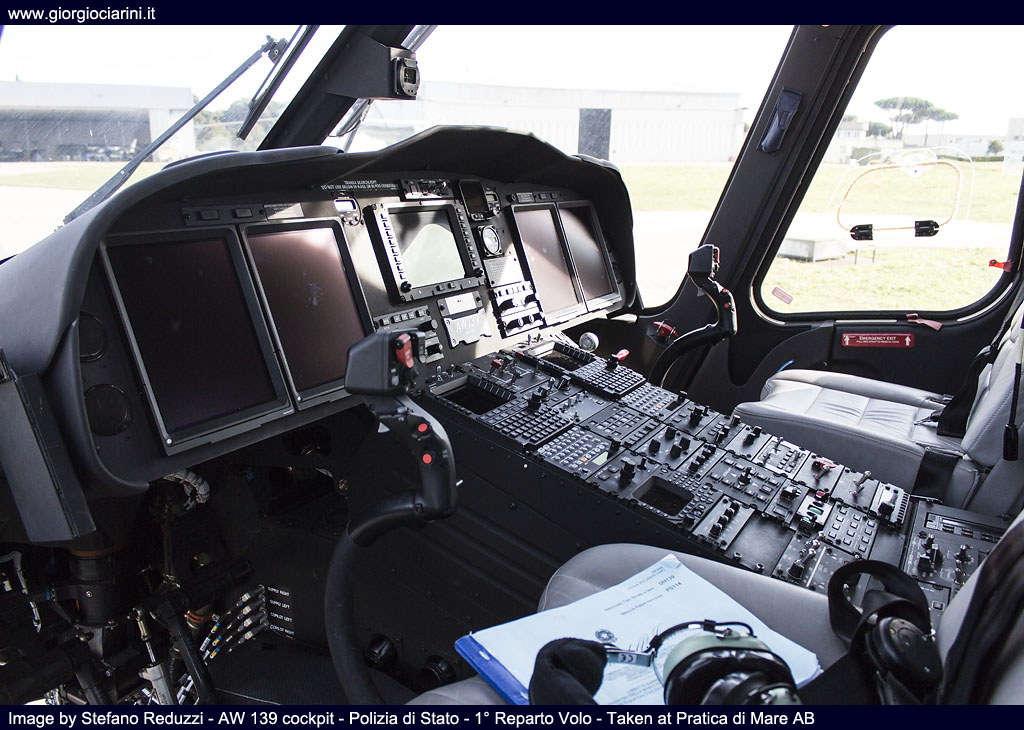 L'AW 139 è un elicottero bi-turbina, polivalente, a 15 posti, prodotto in Italia e negli Stati Uniti d'America. Il velivolo consente un peso max. al decollo pari a 6800-7000 kg grazie all’utilizzo di due turbine Pratt&Whitney PT6C-67C che erogano una potenza di 1.142 kw (1.531 shp) ciascuna, riuscendo a fargli raggiungere una velocità max. 306 km/h (165 kts) con un’autonomia di carburante di 3h e 54’. L’elicottero è stato consegnato nel 2003 nello stabilimento di Vergiate (Varese) dove ha sede l'assemblaggio finale e ad oggi ne sono stati prodotti più di 1.000 esemplari. E’ stato presentato al mercato in diverse configurazioni incluse polizia, eliambulanza, trasporto VIP, SAR (Search and Rescue) e supporto alle piattaforme petrolifere off-shore. I primi elicotteri AW 139 acquistati dalla Polizia di Stato fanno la loro comparsa nel 2012, acquistati anche attraverso i fondi dell’Unione Europea riguardanti il programma FRONTEX (l’agenzia dell’EU per il controllo delle frontiere). Ad oggi la flotta è composta da otto velivoli schierati presso cinque degli 11 Reparti Volo presenti sull’intero territorio nazionale (Pratica di Mare, Fenosu, Bari, Reggio Calabria, Palermo) e di altri due in arrivo nei prossimi mesi, che verranno assegnati ai Reparti Volo di Milano – Malpensa, Venezia e Firenze. La loro entrata in servizio ha portato ad una riorganizzazione interna, sia in termini addestrativi, riguardando il particolare addestramento dei piloti con simulatori FFS (Full Flight Simulator), sia in termini di manutenzione, che ora è demandata principalmente alla ditta produttrice, ma soprattutto in ambiti operativi. L’elevato potenziale di tale velivolo consente infatti alla Polizia di Stato di operare in molteplici e complesse attività come l’ordine pubblico, polizia giudiziaria, controllo del territorio, scorta durante le visite di delegazioni di alte personalità dello Stato, ricerca e soccorso SAR, trasporto sanitario d’urgenza, riprese aero cinefotografiche ed operazioni con corpi speciali della Polizia con maggiore precisione, efficacia, autonomia di carburante e certamente maggior comfort per le persone a bordo. L’equipaggio standard è formato da due piloti (comandante e copilota), e da due operatori di bordo. Uno di questi, in particolare, è addetto al controllo della performante telecamera del velivolo FLIR Star Safire 380 HD che ha una invidiabile portata dello zoom di ben oltre 4 km. Di produzione statunitense e concepita essenzialmente per scopi militari si presta perfettamente, con le sue specifiche caratteristiche (tracking, infrared, ecc.), all’utilizzo durante il servizio di polizia. Le immagini registrate vengono trasmesse direttamente presso le Sale Operative delle Questure richiedenti,così da fornire un formidabile strumento nella complessa gestione delle forze dell’ordine sul campo.