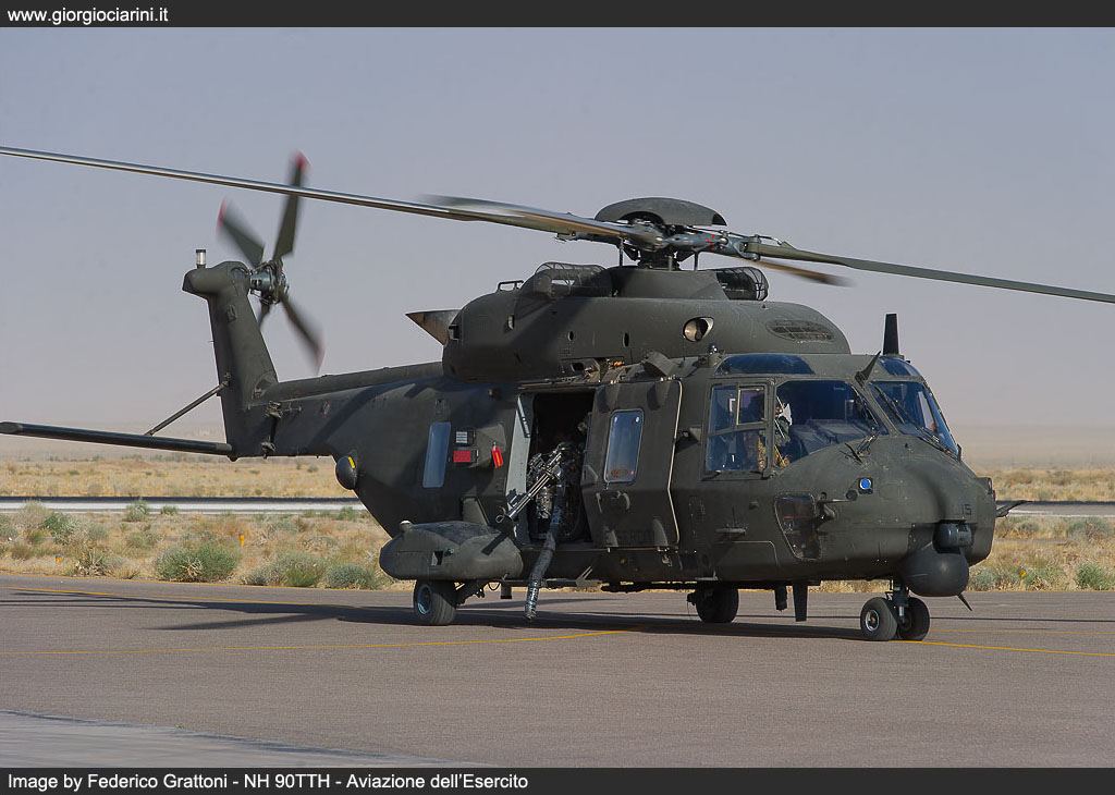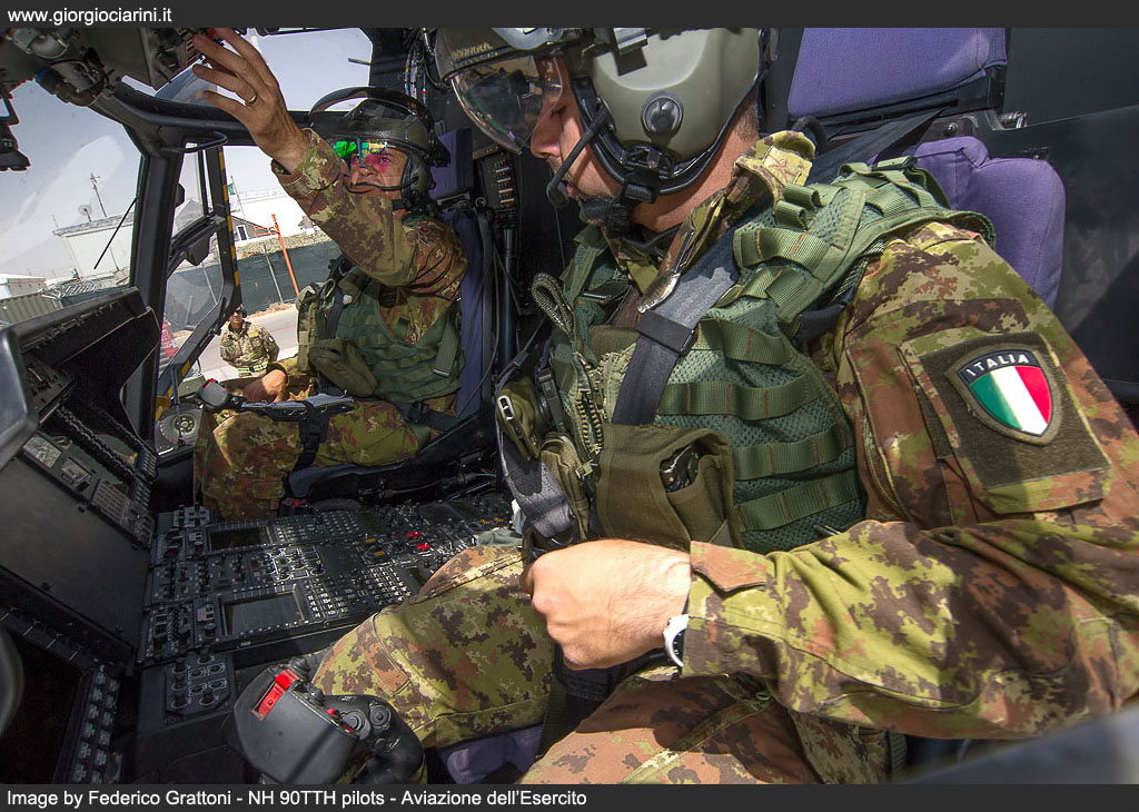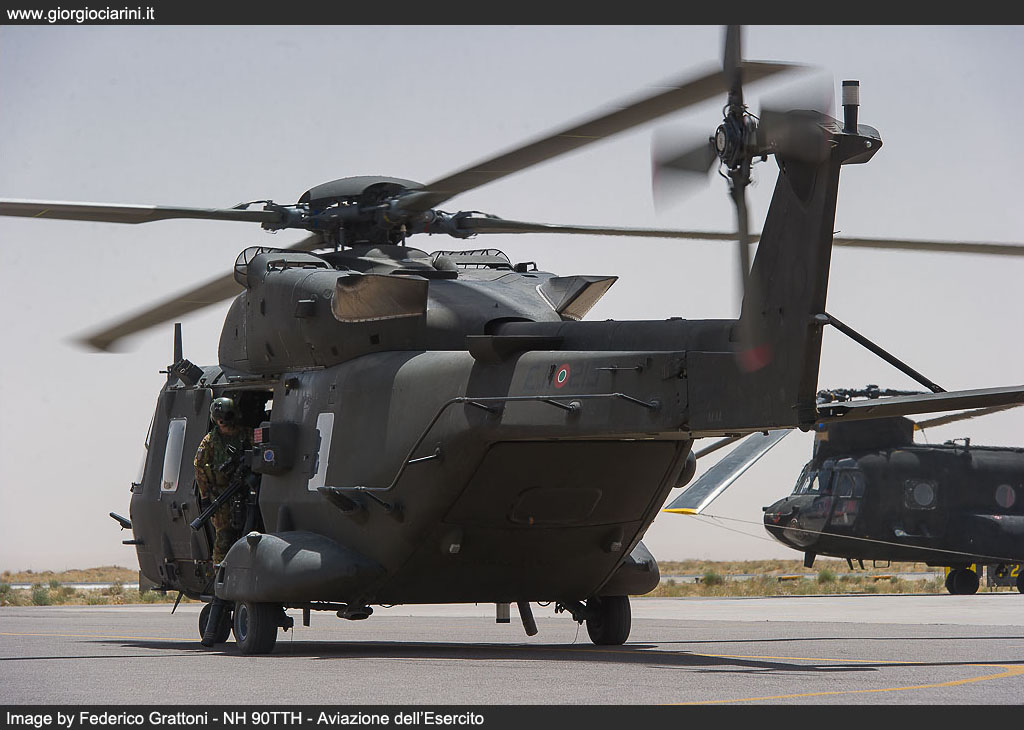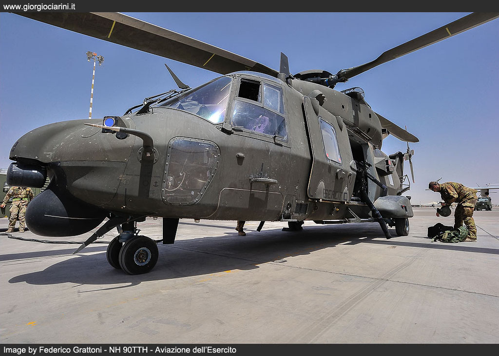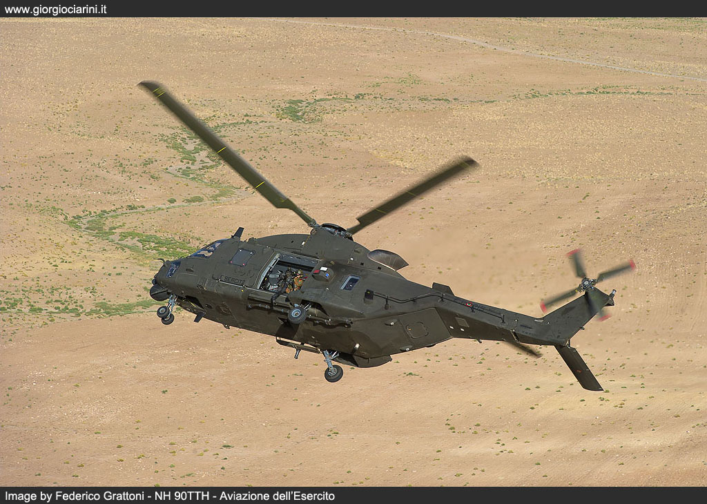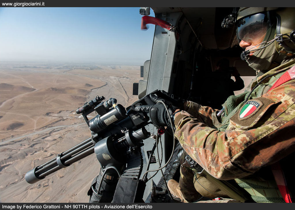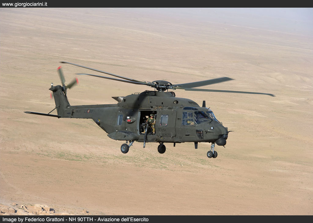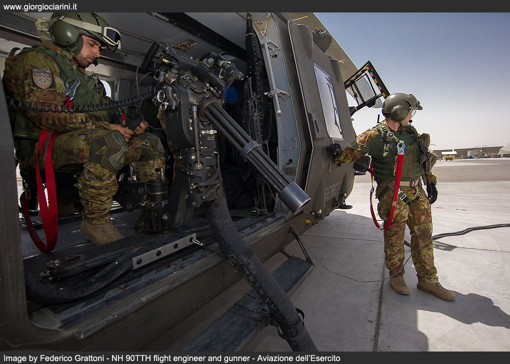 On 20 August 2012 at the FSB at Herat the first flight of an NH 90TTH in the skies over Afghanistan took place. In a flight from Bologna, a C 17A Globemaster III had, two days previously delivered the helicopter in its capacious hold, and the engineers from the 2° Reggimento di Sostegno Orione had quickly returned it to operational condition. Further C-17 flights brought in additional examples (EI-215, EI-219, EI-220, EI-?) and delivered them to Nemo which, by the end of September was able to deliver full operational capability, providing tactical support and Forward Medevac within the entire area of competence of RC-West, previously the role of six AB 205 MEP Mission Equipment Package, which had replaced themselves replaced the first deployment of AB 412. Having overcome some initial technical issues which had hindered their operational debut, it is clear that sufficient time has passed to allow to gather the first impressions of the intense effort that this helicopter had had to sustain in Afghanistan, and to achieve this we reflected on our visit to TF Fenice, which took place at the end of last June, during which we were able to witness and participate in operations, and meet and discuss with the personnel who, in very difficult environmental conditions, are called upon daily to guarantee the availability and operational effectiveness of the “Black Bumblebee”, as the NH 90 or UH 90, under the ARMAEREO designation system, is unofficially known locally in theatre. The Nemo unit was created around two years before the entry into theatre of the NH 90, and is constituted by almost fifty personnel, including aircrew and logistics staff. On the FSB Herat alternates staff from the 53° Grp. Squadroni Cassiopea, of the 25° Grp. Cigno and of the 7° Reggimento Vega, 7° Reggimento Vega from Rimini and also from the 26° REOS Reparto Elicotteri Operazioni Speciali from Viterbo. The unit uses a canvas hangar at the FSB at Herat capable of accommodating all the assigned helicopters (three during our visit) and in which are performed all the checks, from the visual Safety Inspection which occurs every 15 hours to the increasingly more important technical interventions at 50, 150 and 300 hours. All the examples in theatre are obviously IOC+ standard, with advanced initial operational capacity, as FOC Final Operational Capability helicopters are still not available the IOC+ version differ essentially from the FOC through the lack of the SICRAL (Sistema Italiano per Comunicazioni Riservate ed Allarmi) satellite radio system and the Link16, the communications system which offers protected secure communications and imagery exchange between aircraft in the tactical theatre. However, some new practices have been introduced, such as a new presentation of the digital mapping, supplanting the existing display with a kind of overlay of the area of competence which offers corridors, waypoints, routes, ranges, points to avoid, FOB, and 3D cartography which enables the interpretation through colour coding of the altitude relative to the area being over flown; there is, moreover, an autonomous navigation system based on two inertial platforms served by the GPS system, on which has been mapped waypoints, corridors, routes, and, on some airfields, the autonomous approach, approach procedures which the helicopter can follow. Finally, although only a couple of examples have it fitted, the type can accommodate the Rover4 system, enabling it to receive imagery directly from the Predator and AMX assets. In depth testing in a hot and extremely dusty environment was conducted at Logrono, in Spain, but it is Afghanistan where the real test of the capacity to land or take-off in conditions of reduced or almost total absence of visibility have been undertaken. However, while the average temperature and elevation have not eroded the engine power output – take-offs at 45° C at one thousand or more metres have been conducted without problem – the most insidious aspect is constituted by landings on very dusty terrain, which in brown out conditions can totally destroy forward visibility in one of the most delicate phases of flight. An indispensible is provided in these cases by the three systems linked to the HMSD Helmet Mounted Sight and Display, the visor present on the pilot’s helmet, on which are projected light intensified images, infra-red imagery from the FLIR, and symbols which indicates position, the data from the radar altimeter and a variometer coupled to the inertial platform, guaranteeing on frequent occasions greater safety while manoeuvring. Dust is ever present on the ground during landing and take-off manoeuvres away from the airfield, but also at low altitude, due to strong winds which frequently develop, and which create real dust clouds. It is this threat that represents the background to some concerns: infiltration of dust can in fact create damaging accumulations and phenomena such as abrasions or anomalous wearing of the moving parts. During the two 300 hour overhauls conducted in theatre, no particular problems have been discovered. The avionics bays which are cooled with ventilation driven though a vortex filter have not provided evidence of any particular accumulation, while only the weapon systems have demonstrated a requirement for attention, and more frequent maintenance. The engines have been equipped with an extremely valid and efficient separation system and, at this time, the periodic engine power test which are conducted every 25 hours have not revealed any degrading of the level of power output, and only depot level maintenance can reveal possible early wearing of the compressors, accumulations, or erosion in the hot areas. The armament consists of two Dillon Aero M134D Gatling 7.62 mm machine guns mounted on a mobile system which permits their installation and removal on the side of the cabin doors; each possesses a battery pack providing independence from the electrical system, a