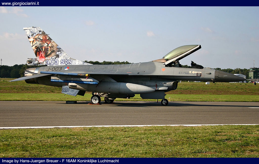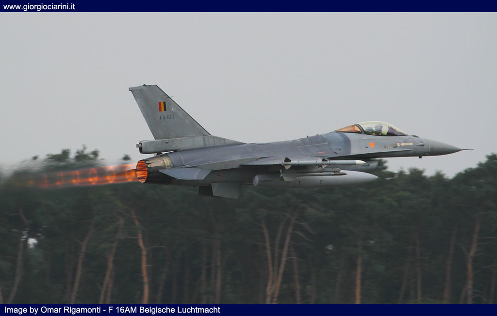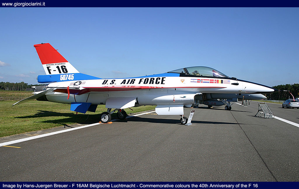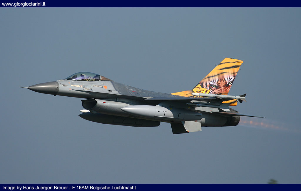 Il primo volo dell’F 16 avvenne a Fort Worth (Texas) il 24 gennaio del 1974. Belgio, Danimarca, Paesi Bassi e Norvegia hanno deciso nel 1975 di acquisire questo nuovo aereo da combattimento in grado di sostituire gradualmente i loro F 104G Starfighter. Il primo di 116 F 16 ordinati e costruiti su licenza dalla SABCA (attualmente presente presso l’aeroporto di Bruxelles Charleroi) ha volato il 26 gennaio del 1979 andando poi ad equipaggiare progressivamente il 349° e il 350° Squadron. Il 7 gennaio del 1981 il 349° Squadron è diventata la prima unità della NATO in Europa ad essere dichiarato operativo su questo nuovo tipo di velivolo. Presso l’aeroporto di Kleine Brogel l'ultimo F 104 Starfighter è rimasto operativo fino al 26 settembre del 1983; nel frattempo le consegne di F 16 al 23° Sq (attualmente sciolto) e al 31° Squadron hanno continuato fino a marzo del 1985. L'Air Force belga ha ricevuto un totale di 96 monoposto F 16A e 20 biposto F 16B. Allo stato attuale, 45 F 16AM e 9 F 16BM volano con il 31° e il 349° Squadron e con l’OCU presso la base di Kleine Brogel, mentre il 1° e il 350° Squadron sono di base a Florennes. Cinque velivoli sono invece tenuti come riserve.