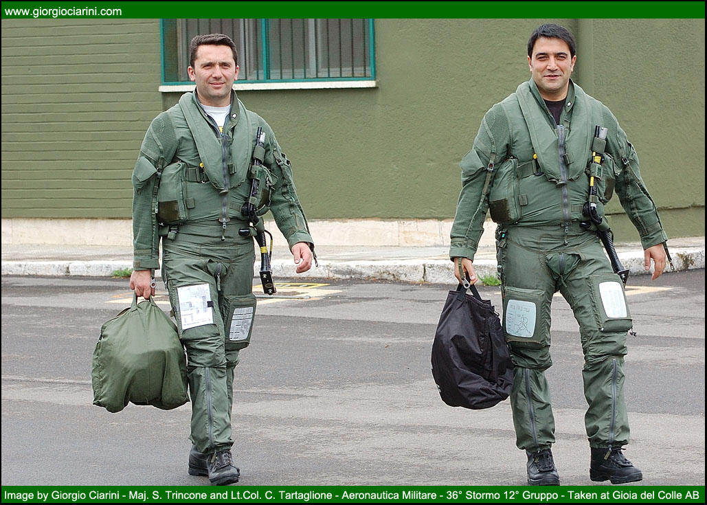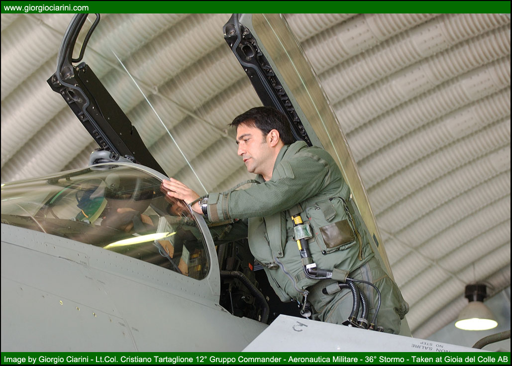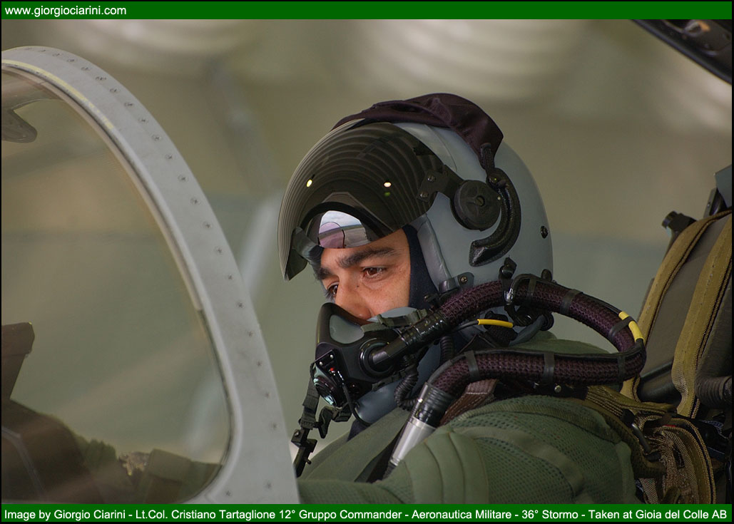 Durante la nostra permanenza abbiamo potuto conoscere l’attuale Comandante del 12° Gruppo, il Tenente Colonnello Pilota Cristiano Tartaglione, egli è nato a Castellammare di Stabia il 3 novembre del 1969. Si è arruolato in Aeronautica Militare nel 1989 ed ha frequentato l’Accademia Aeronautica con il Corso Leone IV, nel 1994 ha conseguito il brevetto di Pilota Militare presso la scuola di Laughlin AFB in Texas (Stati Uniti). Nel 1994, dopo la frequenza del corso preoperativo sul G 91T ad Amendola, è stato assegnato alla linea F 104S “Starfighter”, superato il corso di conversione operativa presso il 20° Gruppo OCU (Operational Conversion Unit) di Grosseto viene assegnato al 22° Gruppo del 51° Stormo di Istrana, dove consegue la Combat Readiness sul velivolo F 104S ASA. Sempre nell’ambito del 22° Gruppo è stato Comandante della 353^ Squadriglia. A seguito della chiusura del Gruppo di Istrana Tartaglione viene trasferito al 18° Gruppo del 37° Stormo dislocato in Sicilia a Trapani Birgi, all’inizio come pilota della 75^ Squadriglia e successivamente come Comandante della 82^ Squadriglia in contemporanea a quello di Capo Nucleo Addestramento di Gruppo. Nell' Ottobre del 2000 di nuovo negli “States” presso la base di Sheppard, sede della Scuola Nato ENJJPT (Euro-NATO Joint Jet Pilot Training) dove ricopre l’incarico di pilota istruttore Nato su velivolo T 38A. Nel luglio 2002 diventa pilota della STANEVAL (Standardization Evaluation) come esaminatore sempre sul velivolo biposto T 38A “Talon”. Al rientro in Italia nel novembre del 2003 viene assegnato a Decimomannu in Sardegna con incarico di Capo Sezione addestramento ed operazioni del Centro Sperimentale di Standardizzazione del Tiro Aereo e dal 2004 al 2006 quale capo sezione addestramento e standardizzazione dell’Ufficio Operazioni del Reparto Sperimentale di Standardizzazione del Tiro Aereo. Terminato il periodo in Sardegna nel novembre del 2006 viene trasferito al 36°Stormo di Gioia del Colle dove assume in ordine cronologico l’incarico di Comandante della 351a Squadriglia del XII Gruppo, successivamente Capo Sezione Operazioni di Gruppo ed infine diventa Comandante di Gruppo degli “Strali”, il 10 settembre del 2008. Il Tenente Colonnello Tartaglione è insignito delle Medaglie di Anzianità di Servizio e della Medaglia di Lunga Navigazione e del Distintivo Bellico d'Argento ”specialità caccia” per la partecipazione ad azioni belliche relative alla guerra nel Kosovo. |