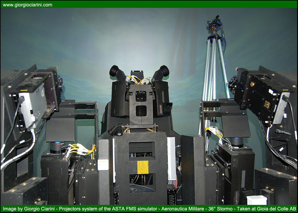 From April 21 of the current year, the XII Gruppo has been able to utilise a Full Mission Simulator ASTA (Aircrew Synthetic Training Aids) latest generation flight simulator, developed with the participation of two Finmeccanica companies, Alenia Aeronautica and Selex Galileo. ASTA is one of the most ambitious training programmes to be launched in Europe. Gioia del Colle is the first Aeronautica Militare base to be supplied with this new training system, created and produced by a perfect synergy between the Italian armed forces and its national aerospace industry. The ASTA system is composed of two types of simulators: “Cockpit Trainers” (CT), utilised for basic training and for some areas of advanced training, and the “Full Mission Simulators” (FMS), in essence, the example that has entered service with the 36° Stormo. The FMS provides an exact replica of the Typhoon pilot’s cockpit, and enables pilots to be trained in all the functions and missions planned for the new fighter. The flying controls, HUD (Head UP Display), avionics, and even the sensors and software for stores management are identical to the real aircraft; even the particulars of the g-seat installed in the pilot’s position are capable of providing the pilot with acceleration sensations very similar to real life. The new simulator, through simultaneous reproduction effected by nineteen high definition projectors, delivers complete 360° vision, and offers both day and night simulations, with a geographic database capable of faithfully reproducing civil and military airfields both in Italy and abroad. If other virtual actors are inserted into the scenario, such as aircraft, vehicles or shipping, these can be realistically visualised on the cockpit displays, as would happen in reality. The utilisation of the new simulation system permits the conduct of exercises at high level and supersonic speeds with a high degree of realism, training in the use of all potential armament in complex tactical scenarios and against very realistic hostile forces, as well as routine training, without any risk to the pilot if called upon to manage an in-flight emergency or technical fault. One of the most relevant functions of the new system is the ability to work “on line” with other simulator stations, allowing pilots in training at different bases to interact in real time and to recreate complex operational scenarios. These advanced simulator missions thus allow the maintenance of pilot training at maximum level in an environmental that is safe and economical, and which also reduces the significant problem of noise pollution derived from night flying or low level training. During our stay with the 36° Stormo, we were present at the deliver ceremony for the simulator. In this context, in order to demonstrate the simulation capabilities of the ASTA FMS system, a two-ship Typhoon mission was reproduced, with a “scramble” to intercept an aircraft which had entered Italian airspace without authorisation and out of radio contact. We were able to see just how realistic a scene the system reproduced, starting from the airfield taxiways, and ending with a simulated “B 747” to intercept and escort.