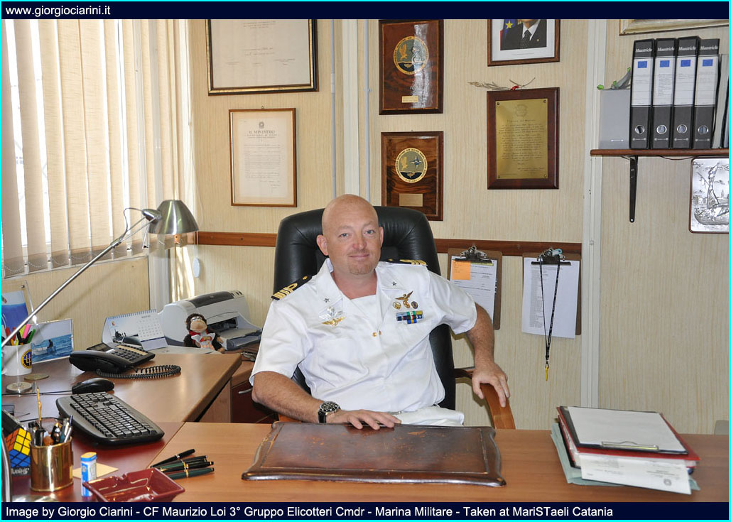 L’attuale Comandante del 3° Gruppo Elicotteri è il Capitano di Fregata Maurizio Loi che ricopre questo ruolo dal 10 giugno del 2008. Loi è nato a Torino il 5 luglio del 1967, appena conseguito il diploma di Maturità Scientifica (1986) presso il Collegio Navale Francesco Morosini, decide di intraprendere la carriera militare, è ammesso a frequentare il Corso Normale di Stato Maggiore presso l’Accademia Navale di Livorno. Nel maggio del 1990 termina gli studi laureandosi in Scienze Marittime e Navali presso l’Università di Pisa e viene inviato presso le Scuole della Marina degli Stati Uniti per ottenere il Brevetto di Pilota Militare, dopo circa due anni ottiene il brevetto di “Naval Aviator”. Come di consuetudine per i neo piloti l’approdo all’attività addestrativa in Italia avviene presso il 2° Gruppo Elicotteri di Catania, dove, consegue le necessarie abilitazioni per pilotare gli AB 212ASW/ASuW. Successivamente viene imbarcato, quale pilota, sulle unità della Squadra Navale. L’attività a bordo delle navi perdura per ben quattro anni consecutivi, dal 1993 al 1997, durante questo quadriennio ricopre vari ruoli, prima Addetto Volo del Cacciatorpediniere Audace e della Fregata Libeccio, poi Capo Componente Aeromobili sulla Fregata Bersagliere. Anche le attività operative non sono mancate in questi quattro anni, partendo dalle operazioni per l’embargo contro la Serbia Erzegovina, passando per le operazioni di supporto alle Forze ONU in Somalia e il controllo dei flussi migratori in Albania. Sempre a bordo della nave Bersagliere ha effettuato il periplo (circumnavigazione della terra) dal luglio del 1996 sino all’aprile del 1997. Nel 1998 con il grado di Tenete di Vascello ha comandato la nave porta acqua Ticino, partecipando alle operazioni del 28° Gruppo Navale presso Durazzo (Albania) e all’attività di rifornimento per l’emergenza idrica verificatasi in Sicilia. Dall’ottobre del 1999 c’è il ritorno alle attività di volo in qualità di pilota imbarcato con l’incarico specifico di Capo Componente Aer sul cacciatorpediniere Luigi Durnad de La Penne, nello stesso contesto, da settembre 2000 al marzo 2001, ha riscoperto l’incarico di Capo Componente Aeromobili della Seconda Divisione Navale e di staff nell’ambito del Comando della Standing Naval Formation in Mediterranean. Terminato l’incarico a bordo delle navi c’è questa volta il periodo di prassi a terra (2001), l’assegnazione è presso il Comando delle Forze Aeree della Marina Militare, con sede a Santa Rosa (Roma), in questo nuovo contesto l’incarico svolto è quello di Capo dell’Ufficio Elicotteri specialità ASW/ASuW che si protrae sino a giugno del 2004. L’impiego successivo è presso la MariSTAeli di Luni come Capo Ufficio Operazioni del 1° Gruppo Elicotteri, durante la permanenza a Luni il Comandante Loi ha avuto modo di conseguire le abilitazioni, e qualifiche necessarie a operare con l’elicottero EH 101. Sempre a Luni, dal luglio 2006 a maggio del 2008 ricopre l’incarico di Capo Ufficio Operazioni della Stazione Elicotteri. Pur essendo basato a Luni, Loi è stato anche impiegato nello staff della Italian Joint Cell presso USCENTCOM (US Central Command) con sede a Tampa in Florida, con l’incarico di Capo Dipartimento Operazioni Navali (J3N) e Comunicazioni (J6). Nella sua ormai lunga carriera Loi ha accumulato circa nove anni d’imbarco, 3.000 ore di volo e più di 1.000 appontaggi, conseguendo le abilitazioni e qualifiche operative sugli aerei T 34C e T 44A e su elicotteri A 109, Bell TH 57A, AB 212 ed EH 101, su gli ultimi due citati è anche qualificato Istruttore di Specialità. Ha frequentato il Corso di Perfezionamento Professionale nel 1994 e il 20^ Corso Normale di Stato Maggiore nel 1997. I molteplici impegni operativi e addestrativi gli hanno valso le seguenti onorificenze: -Medaglia d’Argento di Lunga Navigazione Aerea -Croce d’oro per Anzianità di Servizio -Medaglia NATO (Sharp Guard – Maritime Monitor – Maritime Guard) -Medaglia WEO (Operazione ex-Jugoslavia) -Croce Commemorativa Missioni di Pace in Albania -Croce Commemorativa Missioni di Pace in Somalia -Croce Commemorativa Operazioni Militari in Afghanistan -Medaglia di benemerenza per l’intervento nelle Pubbliche Calamità (PROCIV) -Distintivo Dorato per Attività nei Reparti Aerei MM -Distintivo per Ufficiali ex-allievi Scuola Navale Militare “F. Morosini” |