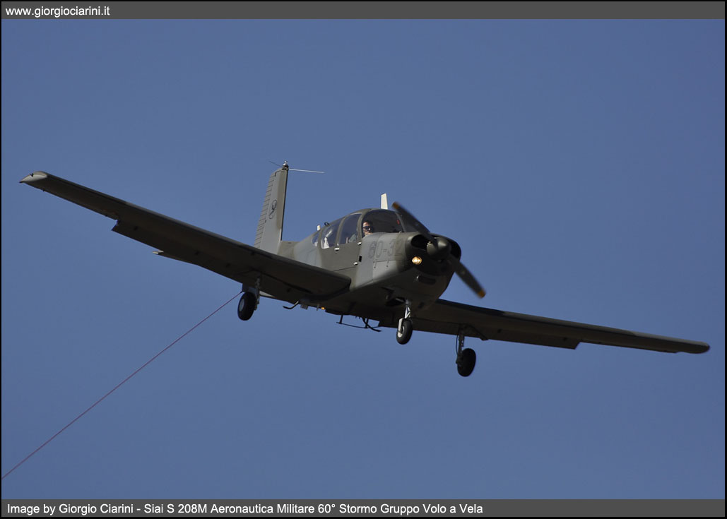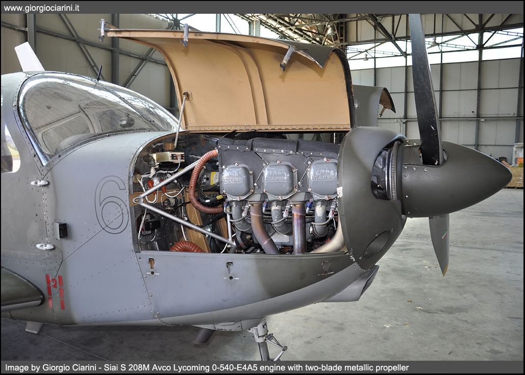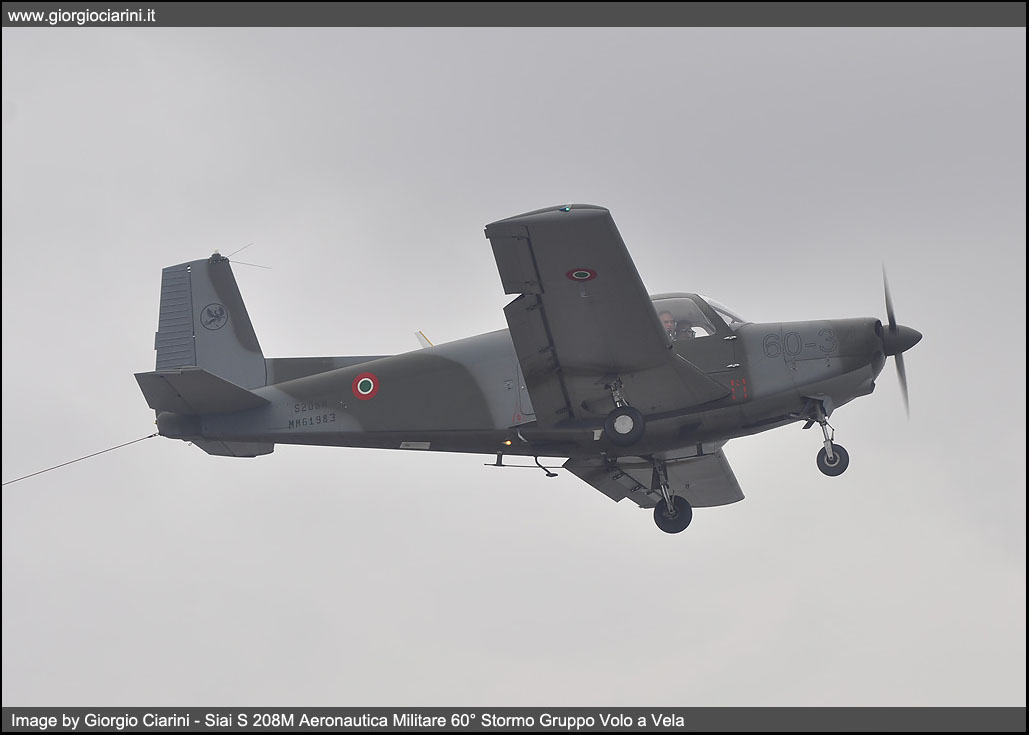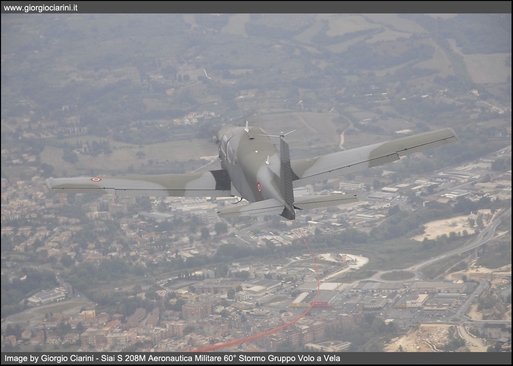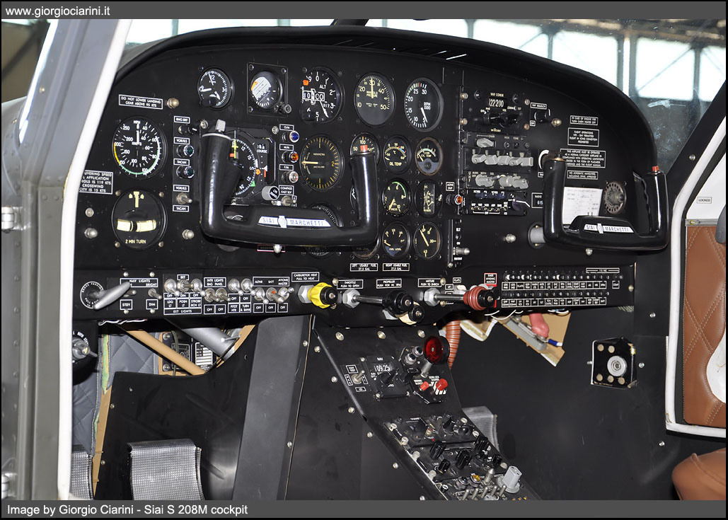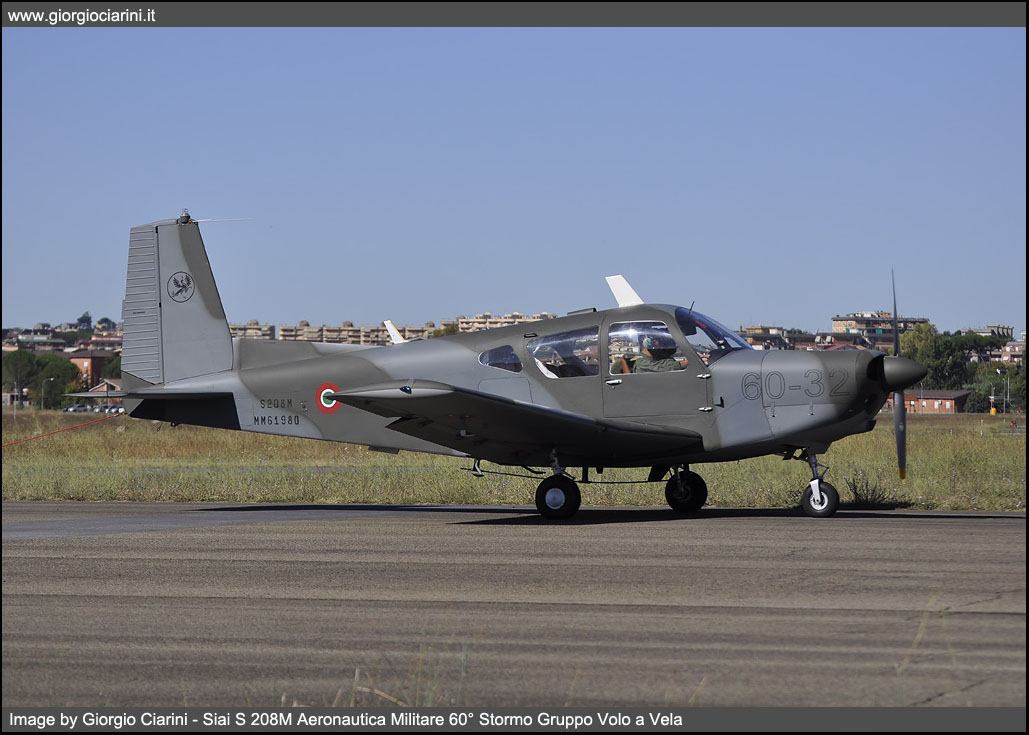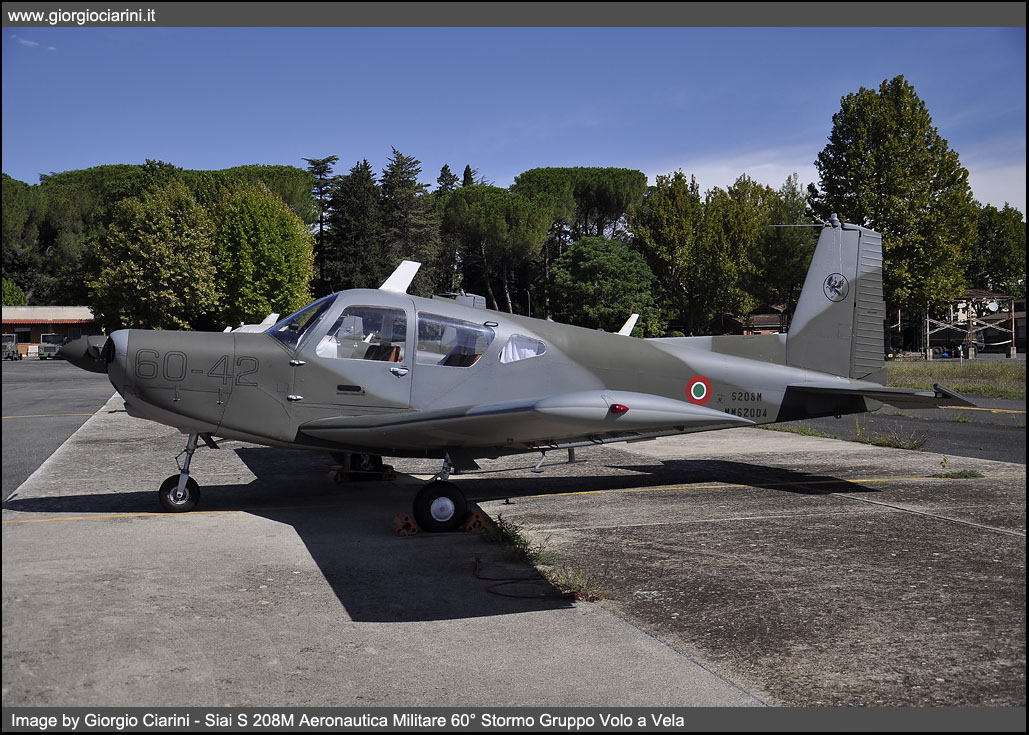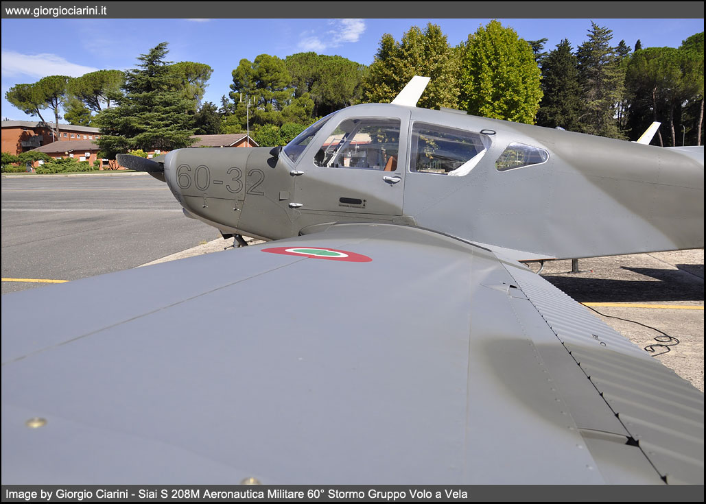 In the mid-60s, the SIAI-Marchetti developed from its light four-seater Siai S 205, a five-seater aircraft, substantially similar but with a more powerful engine. The prototype of this new aircraft, called S 208, flies for the first time on 22 May 1967. Monoplane, single-engine low-wing, all-metal construction has been mass produced since the spring of 1968 and in the first five years were built about eighty, of which over half, intended for the Aeronautica Militare (S 208M) who used him for liaison and training. Other tasks assigned at the civil level to this light aircraft were, marginally, the health, freight transport and finally the agricultural version S 208AG. The version intended for the Armed Force, differed from the civilian version for the modified on-board instrumentation, two doors for the cockpit, the possibility to mount the hitch for towing gliders and the lack of tanks at the wing ends and the use of a retractable trolley; Since 1968 the Aeronautica Militare has received 41 S 208 and four S 205M, the latter were later brought to the standard of 208, the 205 differ from 208 only for the lack of the triangular window behind the main lenses. Since 2004 the General Staff AM has decided to gradually reduce the fleet to a total of 20 units. The twenty U 208M remained, this is the initials assigned to the aircraft since 2006, are all in charge of accounting to the 60° Stormo di Guidonia - Montecelio, while one example is in operational charge of the Linate Squadriglia Collegamenti to carry out liaison services in favor of the Comando delle Forze da Combattimento (CFC or Combat Forces Command) of Milano. In the recent past the U 208M has been updated especially in avionics equipment with the installation of the IFF (Identification Friend or Foe), the receiver for radio navigation via VOR and new radios.