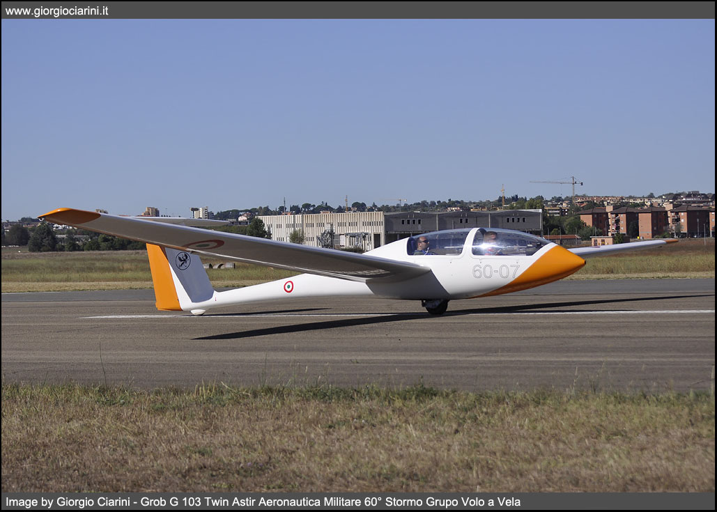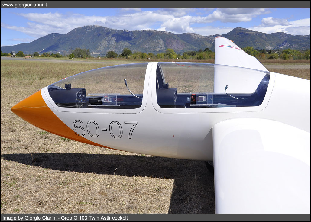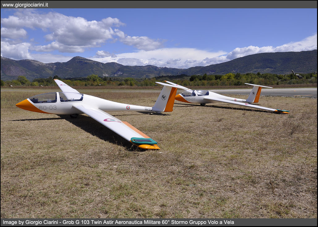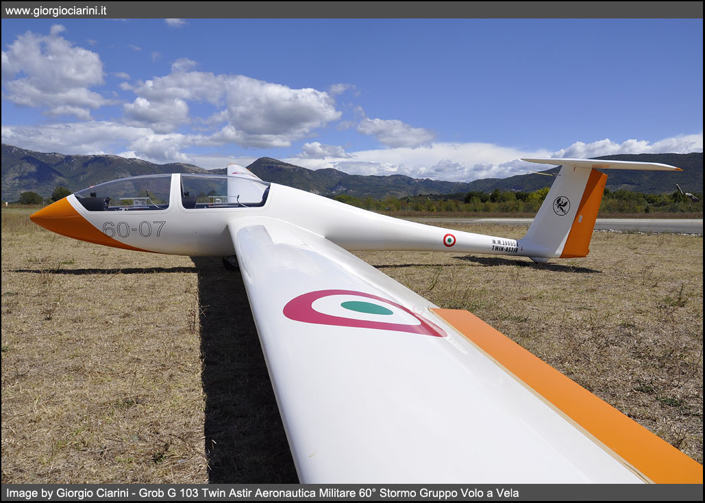 Il Grob G103 Twin Astir II è un aliante prodotto dall’azienda tedesca Grob Aircraft costruito e commercializzato alla fine degli anni 70, il G 103 è uno sviluppo del predecessore monoposto G 102 Astir. Il Twin Astir è un aliante biposto realizzato in fibra di vetro ad ala media e impennaggio a T. La fusoliera presenta una cabina di pilotaggio chiusa da un tettuccio sdoppiato apribile lateralmente, dotata di due posti in tandem equipaggiati di doppi comandi situata in posizione avanzata, sul Twin Astir il pannello degli strumenti è installato su entrambe le posizioni. L’ala montata ad altezza media rispetto alla fusoliera è rettilinea e a pianta triangolare raccordata in prossimità delle estremità alari e con bordo d’attacco ad angolo retto rispetto alla fusoliera. Il carrello d’atterraggio è monotraccia ed è fisso, il ruotino posteriore è fisso anch’esso, per movimentare l’aliante è necessario montare un ruotino aggiuntivo sterzante che tramite una fascia si colloca prima della trave di coda.