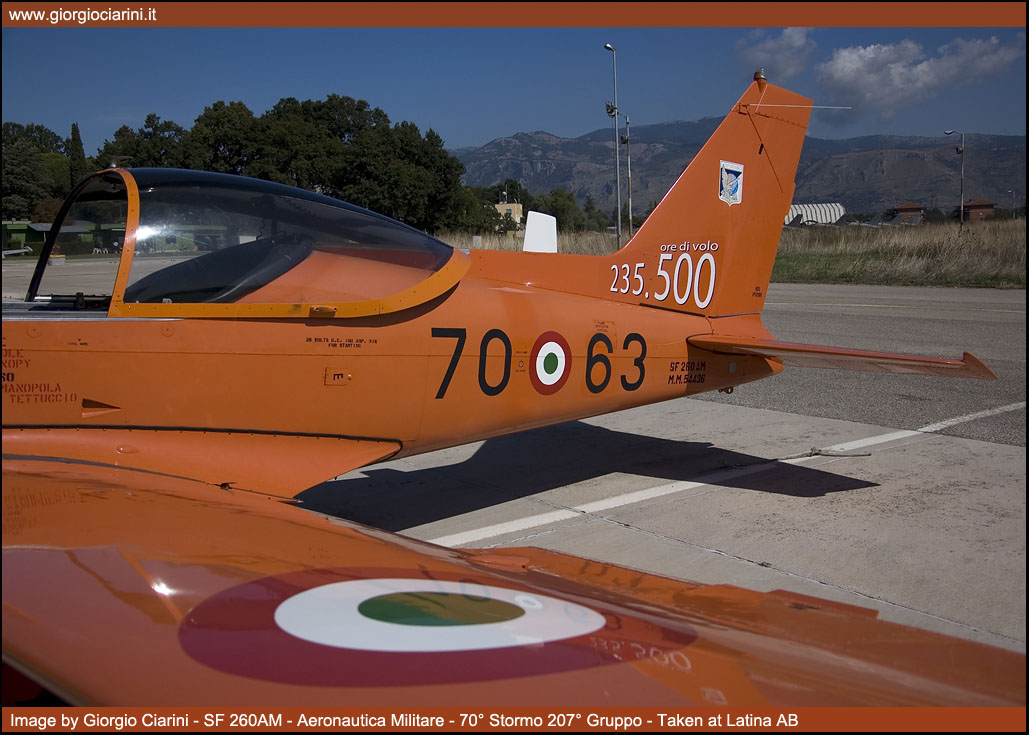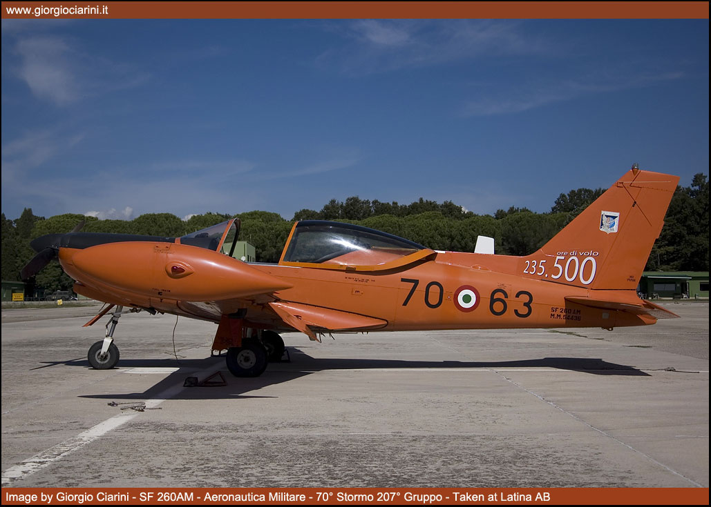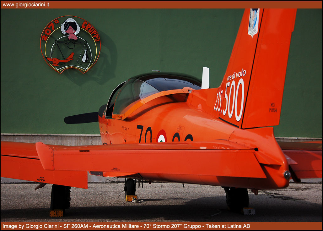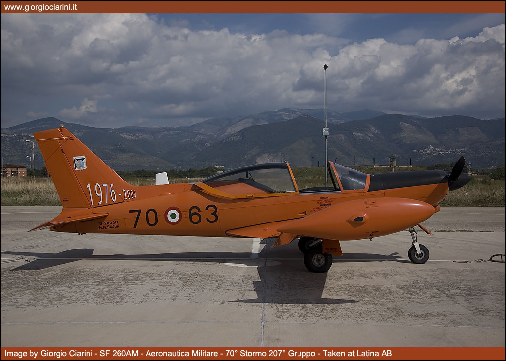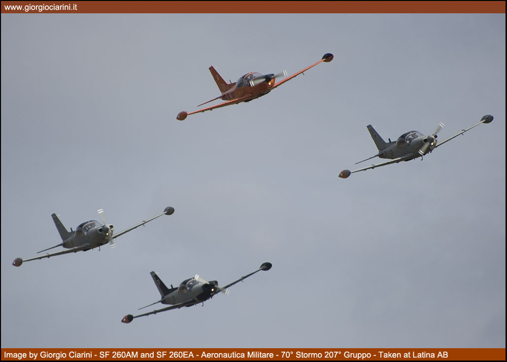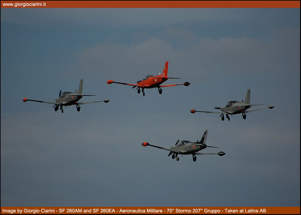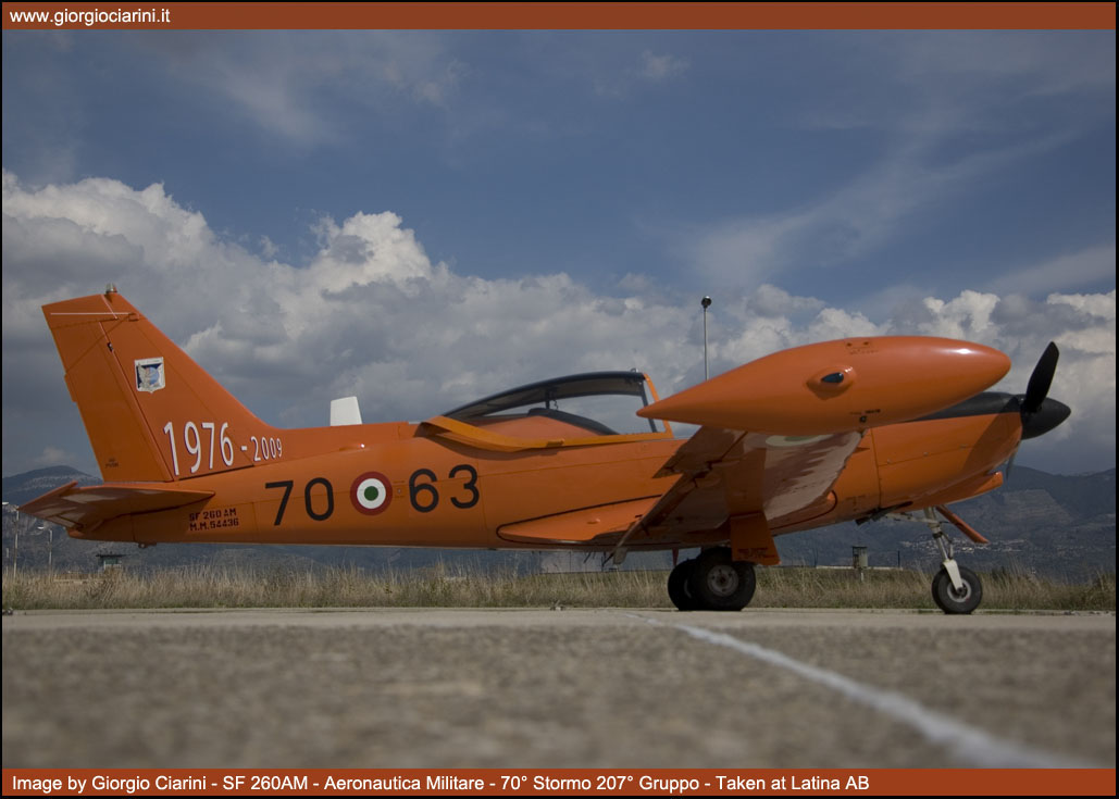 Il 19 settembre 2009 dopo una prestigiosa carriera durata 33 anni, l’incredibile cifra di 235.500 ore di volo effettuate e l’altrettanto ragguardevole cifra di oltre 4.500 allievi brevettati, il mitico SF 260AM “arancione” ha effettuato il suo ultimo volo nei ranghi dell’Aeronautica Militare. L’SF 260 fu progettato agli inizi degli anni sessanta dall’Ingegnere Stelio Frati come sviluppo dell’F 8 Falco, velivolo biposto con posti affiancati, 1.200 kg di peso massimo, motorizzato con un Avco Lycoming 0-540-E4A5 per una potenza di 260 Hp, il velivolo è stato sviluppato come aereo sportivo e da turismo, ma grazie alle sue grandi capacità ha avuto un largo successo nelle scuole civili e militari di mezzo mondo, costruito in oltre 850 esemplari è stato uno dei velivoli di maggior successo dell’industria aeronautica italiana. Oltre alla versione basica specifica per l’addestramento sono state realizzate anche la versione armata denominata SF 260W “Warrior” e la versione con un motore turboelica al posto del motore a pistoni denominata SF 260TP. Nel 1976 l’Aeronautica Militare ricevette dalla Siai Marchetti 45 esemplari denominati SF 260AM, i velivoli sono sempre stati dislocati presso la Scuola di Latina e utilizzati per conferire agli allievi frequentatori il BPA (Brevetto Pilota Aeroplano), scuola che nel corso degli anni a cambiato diverse denominazioni partendo dal lontano 1939 come Scuola di Volo Senza Visibilità (SVSV), poi come Scuola Istruzione Equipaggi, ancora come Scuola Addestramento Plurimotori (SAP) e nel recente passato come Scuola Volo Basico Avanzato Elica (SVBAE) per arrivare ai giorni nostri come 70° Stormo. L’SF 260AM che ha raggiunto il suo meritato e compianto “riposo” vede comunque continuare la propria missione dal “fratellino maggiore” SF 260EA “grigione”. La versione EA è entrata in servizio presso la Scuola di Latina a partire dal 2005, ed è una versione aggiornata con strumentazioni all’avanguardia che permette alla Forza Armata lo svolgimento di corsi più avanzati, andando a sostituire in alcuni casi l’utilizzo di velivoli più sofisticati ed economicamente più dispendiosi. |