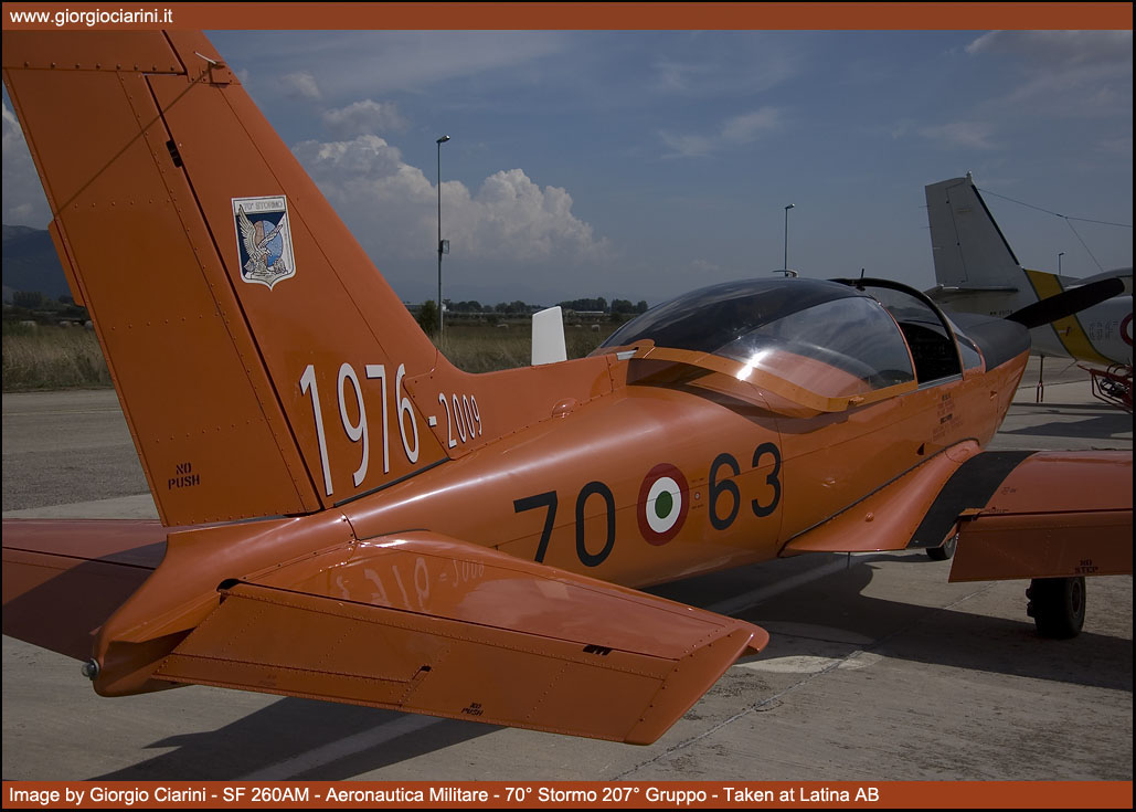 Il velivolo che ha effettuato l’ultimo volo è l’esemplare riportante la Matricola Militare 54436 e il codice 70-63, mentre come numero di costruzione è il 264 consegnato all’Aeronautica Militare nell’estate del 1976, per l’occasione sulla deriva sinistra è stata verniciata una scritta riportante il totale delle ore di volo effettuate da tutti i “260AM” nel periodo 1976-2009, quest’ultima data, che invece è stata pitturata sulla destra della deriva, è a testimonianza dell’entrata in servizio e della successiva dismissione dei medesimi velivoli. Il 19 settembre giorno della cerimonia sono stati eseguiti dei sorvoli da parte di una formazione di quattro velivoli, ovviamente il “leader” della formazione è stato proprio il “260” arancione con ai comandi il Colonnello Magazzino, Comandante del 70° Stormo, e come “allievo d’eccezione” il Generale di Squadra Aerea Gargini, Comandante delle Scuole di Volo AM, l’ultimo dei sorvoli a raffigurato la separazione dell’SF 260AM dai restanti “260EA” per decretarne il definito ritiro. |