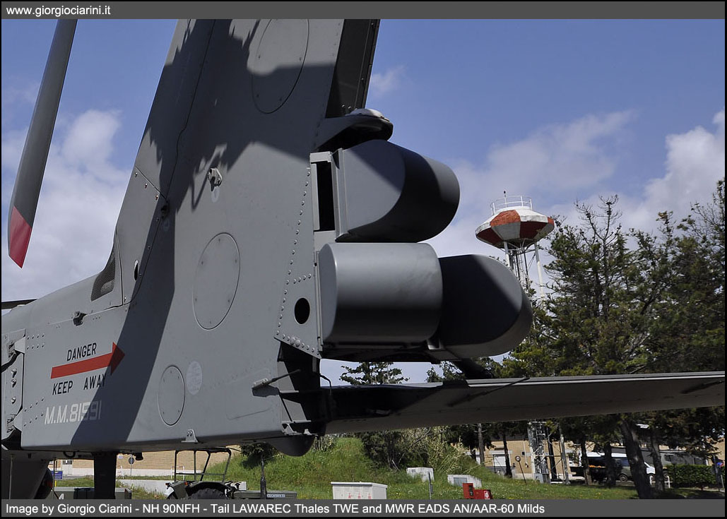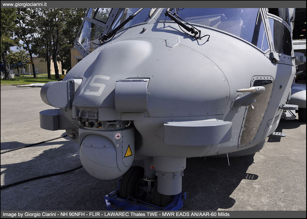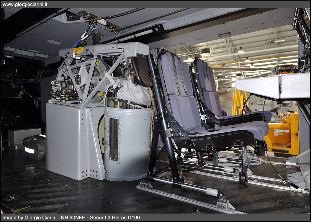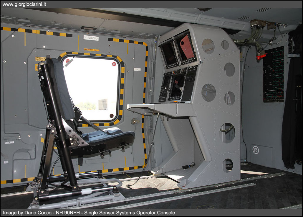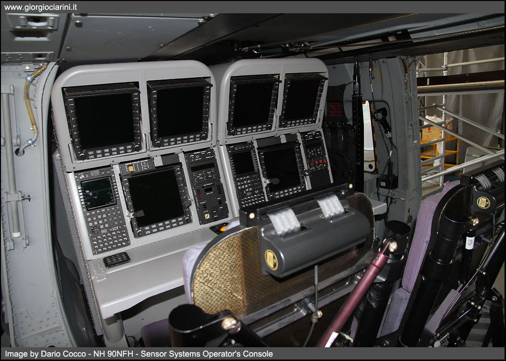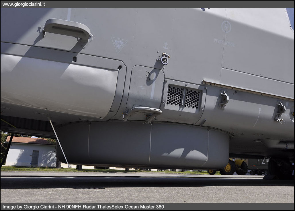 The NH 90NFH has been developed to perform specific tasks in marine and naval fleet support, the main roles are: -ASW Anti Submarine Warfare - combating submarines -ASuW Anti Surface Warfare - fighting ships -Search and Rescue (SAR - Search and Rescue) While the complementary roles are: -Monitoring and control of maritime traffic -Limited air surveillance capacity (AEW Airborne Early Warning) -Logistical transport and support -Supply of vessels with VERTREP system (vertical REPlenishment) -Medical evacuation (CASEVAC Casualty Evacuation) -Special Operations Anti Terrorism and Anti Piracy The NH 90NFH Mission System, defined all-in-one, allows to perform the three main ASW-ASuW-SAR tasks only by modifying the mission profile, thanks to a system of voice sensors, data and weapon that uses data fusion techniques that facilitate the decision-making of pilots and operator. This simplicity of mission management is manageable by a crew of only three, if necessary a second console for a second operator can be installed, the system is very versatile and both operator screens are interchangeable to display mission data, for the benefit of operating and training scenario management. Mission equipment includes the presence on the NH 90NFH of: -Thales Selex Ocean Master 360 high-resolution image detection, navigation and weather radar (ISAR - SAR) -FLIR (Forward Looking Infrared) Sagem Euroflir -Anti missiles system EADS AN/AAR-60 Milds -Thales TWE radar and laser alarm system -Chaff and Flares countermeasures system -Radar obstacle-fighting Selex LOAM -Helmet Thales TopHwl -Sonar L3 Helras D100 -IFF (Identification Friend or Foe) -Transmission system Data Link 11 -Online Map Generator -One or two mission consoles -Sound buoys -Two anti ship missiles Mars Mk2/S -Two Torpedoes