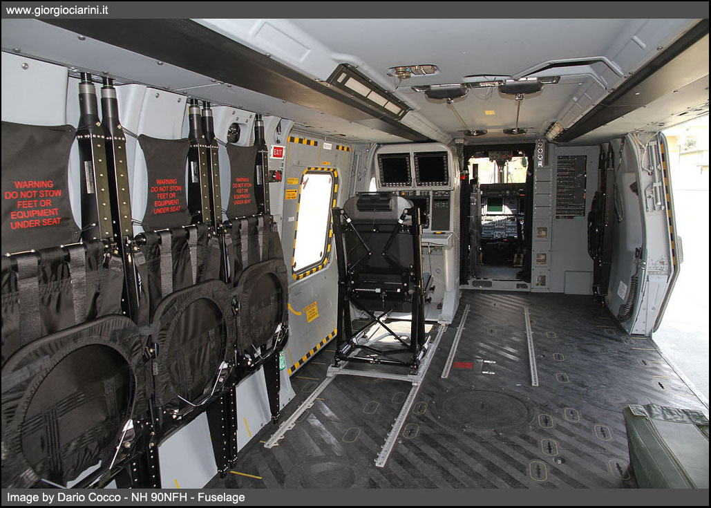 The NH 90 is designed to operate mainly on board the Frigates of the Marina Militare, the main characteristics that give it this ability are a system of hooking to the flight deck through a harpoon that allows it to carry out a landing safely even with very rough sea. A system of folding of the blades of the main rotor and the end of the tail beam allowing it to be housed in the hangar on board. A transverse motion system for moving from the flight deck to the hangar and vice versa. A ship/helicopter communication system to co-order landing and take-off manouvres simultaneously. A fast data communication system umbilical cable data exchange of mission parameters between helicopter and ship. An advanced landing aid navigation system in day and night conditions and in adverse sea conditions based on exact knowledge of the vessel’s position. The cabin design and compact design of the NH 90 consoles allow quick configuration for simultaneous multi-role missions, the speed of reconfiguration of the mission systems from transport or sanitary evacuation allow a change of role in case of need. Some versatility examples of the NH 90 are listed below: -ASW mission with three elements -ASW mission with four elements -AsuW -Transport mission with 14 seats -ASW/ASuW mission with attached seven-man transport mission -Medical evacuation mission with nine stretchers -Search and Rescue Mission