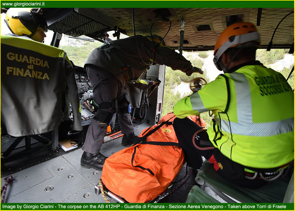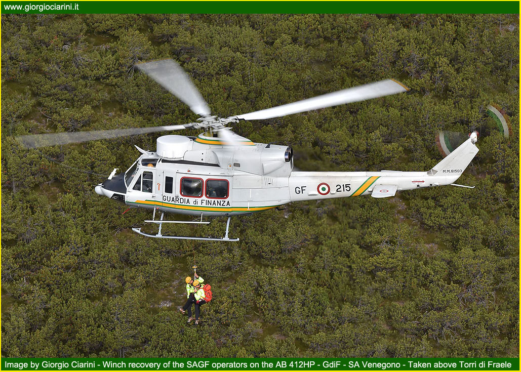 The exercise The introductory part of the event was illustrated by Chief Pilot Marshal Stefano Cortese (Sezione Aerea Varese) and Assistant Marshal Maioglio (SAGF Sondrio) with a briefing based on the technical aspects of the search and rescue operation. The "livex" part of the exercise begins by simulating a distress call received at the Operations Room of 117 in Sondrio as per procedure of Azienda Regionale Emergenza Urgenza (AREU or Regional Emergency Urgency Company) 118 by sending SMS, preceded by communication to the same Hall of an information for the failure to return of a geologist engaged in monitoring the territory of the area of Cancano. Given the particular situation, with the interruption of all access roads and numerous points of landslide, it is necessary to carry out the search by aerial reconnaissance. Therefore it is used the fast and agile NH 500MD "Volpe 117" which proceeds to a targeted reconnaissance until the identification of the missing. During the search the operating base assigns to the rescuers the areas of participation and the management of the "chronological activity". At the time of detection of the missing is activated the crew of AB 412 "Volpe 215" to begin the transport of two rescuers of SAGF above the point indicated by the scout. With two distinct flight operations are carried and winched two military TSA (Alpine Rescue Technician) who are responsible for the discovery of the missing and a third military TE (Helicopter Rescue Technician) equipped with stretcher that must organize the recovery. Unfortunately, having ascertained the death, the rescuers put themselves in contact with the operative base that must in turn communicate with the competent Pubblico Ministero’s (Public Prosecutor) Office, to authorize the removal of the body. Pending authorisation, the SAGF military will install an "alpine cableway" that will allow you to bring the stretcher and body to a predetermined point where it can be boarded by winch on the AB 412. Once the authorization from the Pubblico Ministero on duty is started the transfer to the predetermined point, with the arrival of AB 412 begins the recovery of the stretcher and TE of SAGF, another military from the ground assists the operation by maneuvering the anti-rotation cable, the next step is the transport of the body to the nearest morgue, where it will be made available to the Autorità Giudiziaria. A further appendix of the exercise came with the communication that one of the soldiers who was performing the demonstration climbing along the "route" named after "Chicco Longo", was "encrusted" (technical term that defines the locking of the same with its own climbing ropes) on a ledge and need for help. Ready the intervention of two TSA that descending on the wall proceed to lay the victim on a stretcher "Kong" to be lowered to the ground, obviously this was also a simulation to demonstrate the speed and accuracy of intervention of SAGF staff. The end of the operations is sanctioned with a de-briefing held by the organizers and a "virtual encomio" manifested to the soldiers present by the General of Corpo d'Armata Giuseppe Vicanolo during the reflection of farewell.