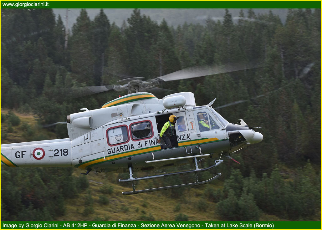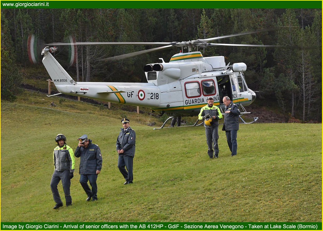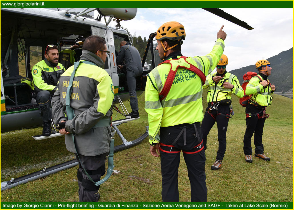On Tuesday, September 18th, a joint exercise was held with the participation of the Sezione Aerea Varese (Air Section) and the SAGF (Soccorso Alpino della Guardia di Finanza) Stations of Sondrio, Madesimo, Edolo and Bormio. The event was dedicated to Chicco (Gianenrico) Longo, 40-year-old financier of the SAGF, who died of natural causes during an Alpine Rescue exercise in the upper Valfurla (Pizzini refuge) on Wednesday, April 28, 2010. The exercise was organized and managed by the Reparto Operativo Aeronavale (ROAN or Aeronaval Operations Department) of Como and the Comando Provinciale (Provincial Commands) of Sondrio and Brescia, about thirty militaries engaged, nine for the flight crews, about twenty for the teams of the SAGF departments. The exercise was held in the presence of the Comandante Interregionale (Interregional Commander) for Northern Italy of the Guardia di Finanza (Italian Custom Police) Generale di Corpo d'Armata Giuseppe Vicanolo and the Comandante Regionale (Regional Commander) of Lombardy, General of Division Piero Burla.