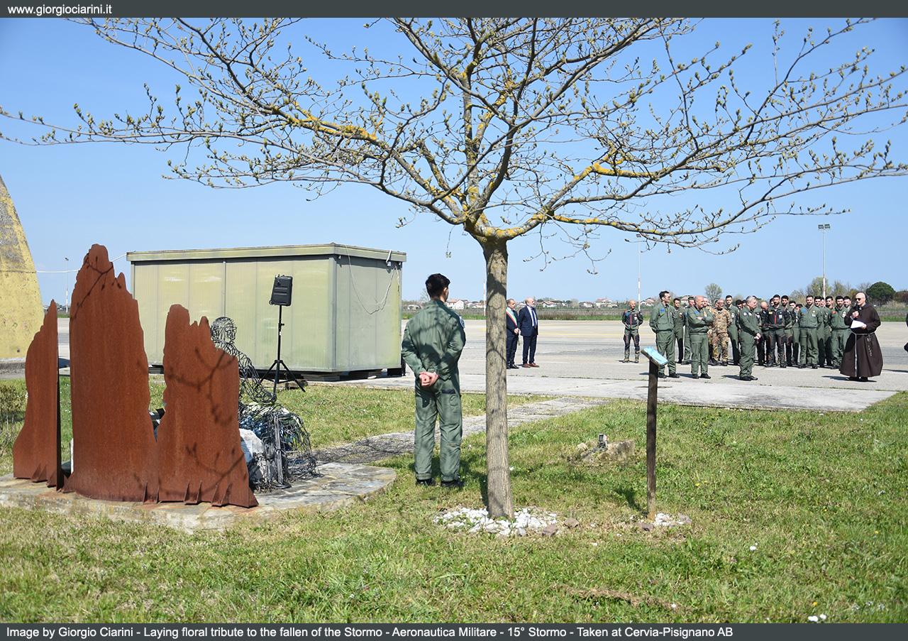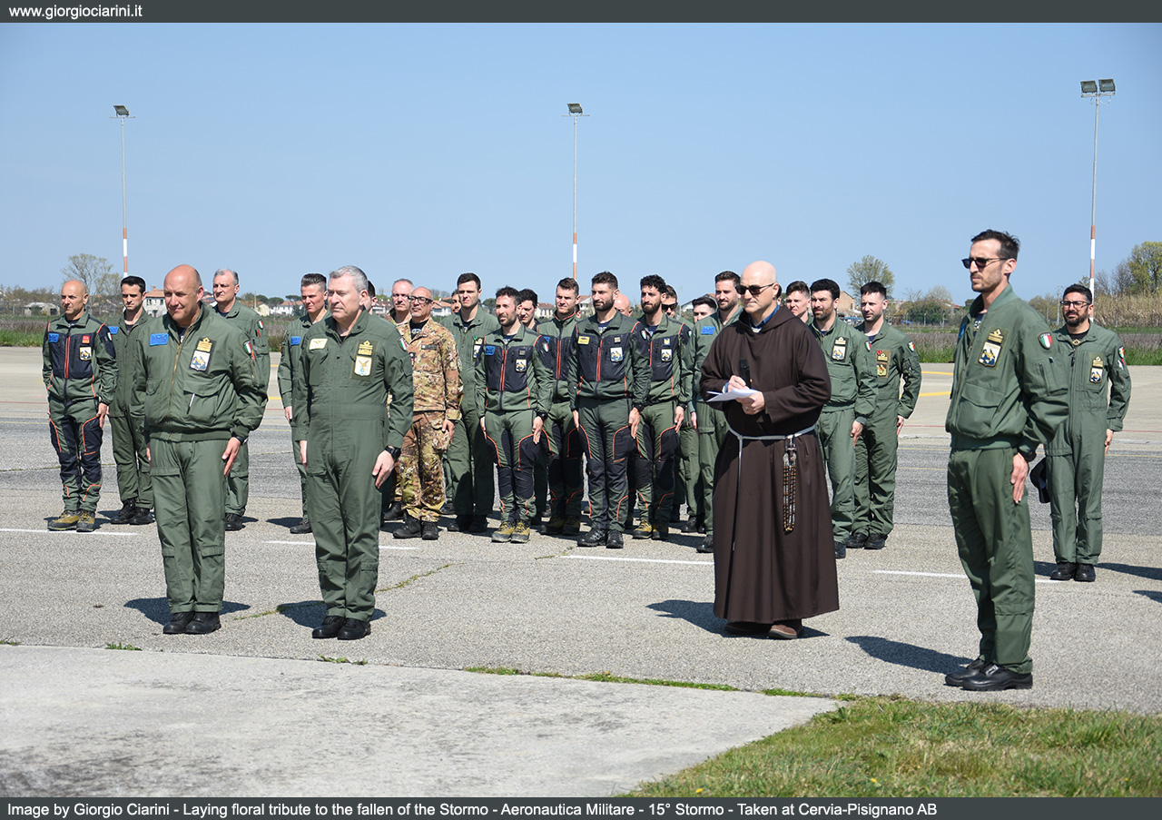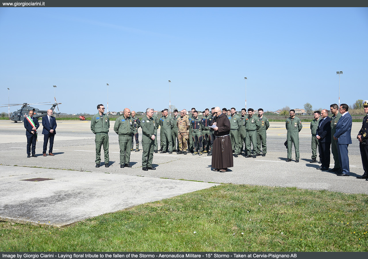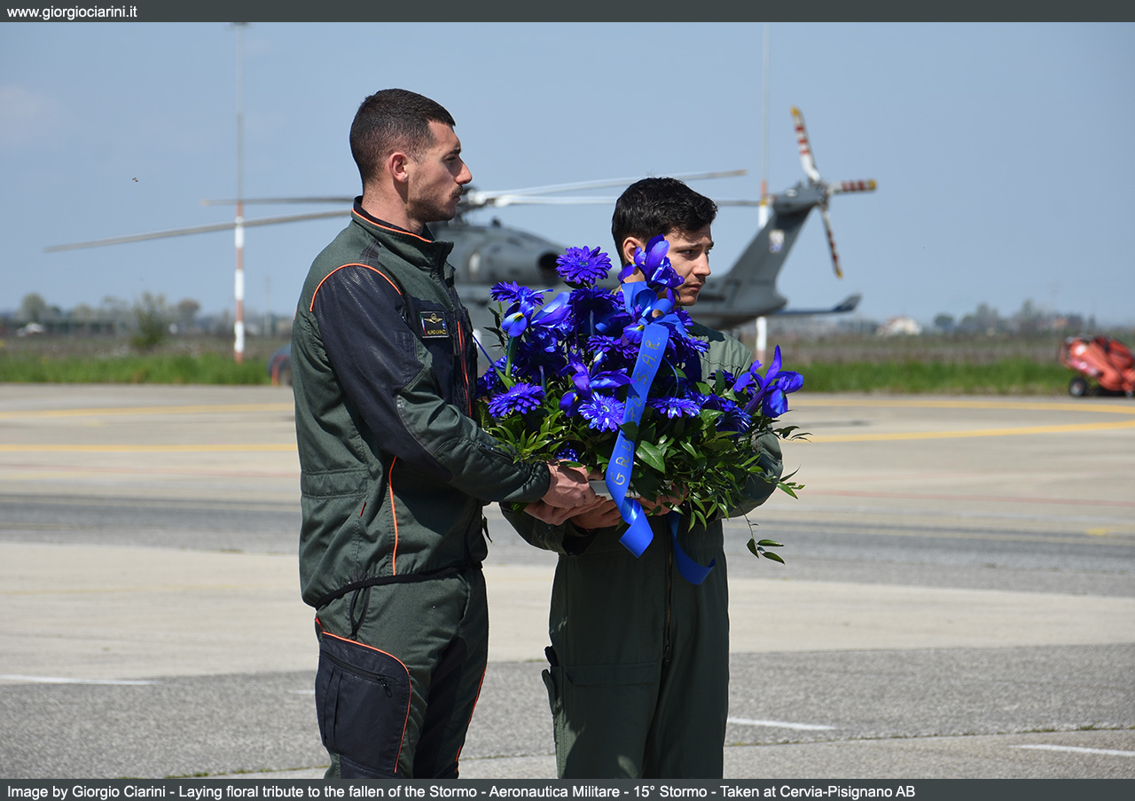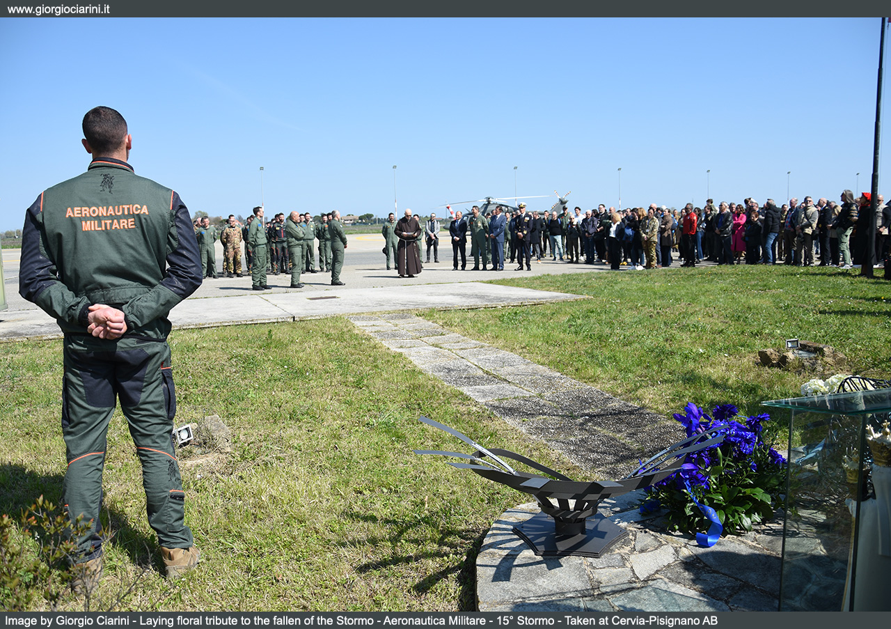 La parte più commovente, che ha coinvolto tutti i presenti, è stata la deposizione di un colorato omaggio floreale ai piedi del monumento dei caduti dello Stormo, il ricordo è subito andato all’incidente del 23 ottobre del 2008, quando un elicottero HH-3F decollato da Rimini (fino al 2010 sede dell’83° Gruppo) e diretto a Florennes (Belgio), è precipitato nei pressi di Strasburgo (Francia) causando la morte degli otto membri dell’equipaggio. A margine della deposizione dell’omaggio floreale il Cappellano Militare ha tenuto un lungo discorso sulla qualità delle azioni che determinano la vita di ogni persona. |