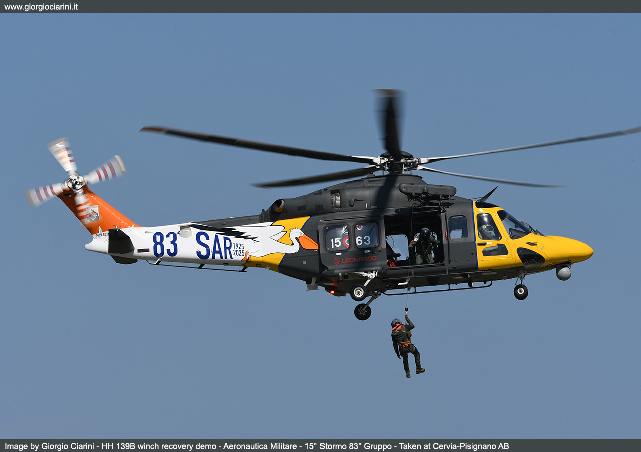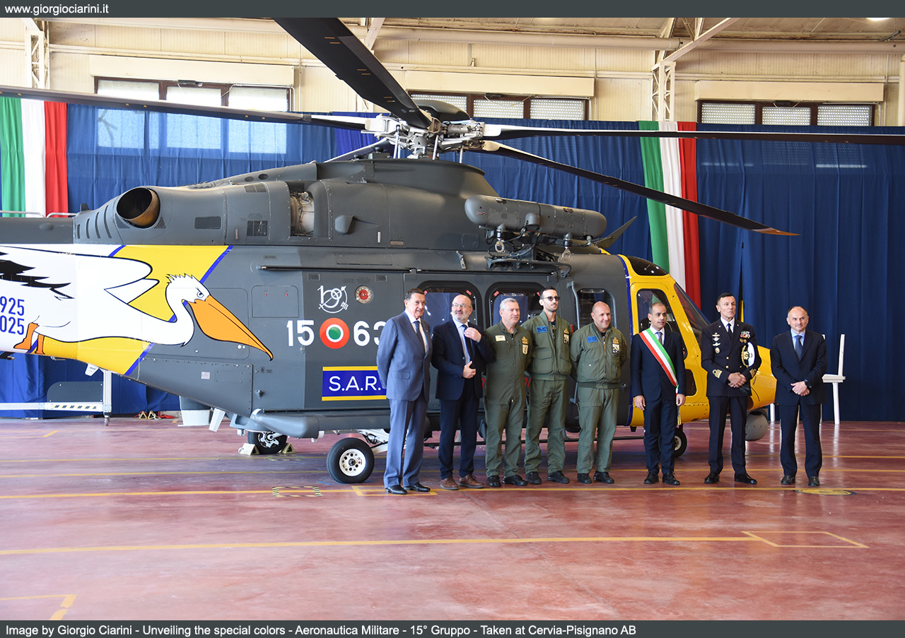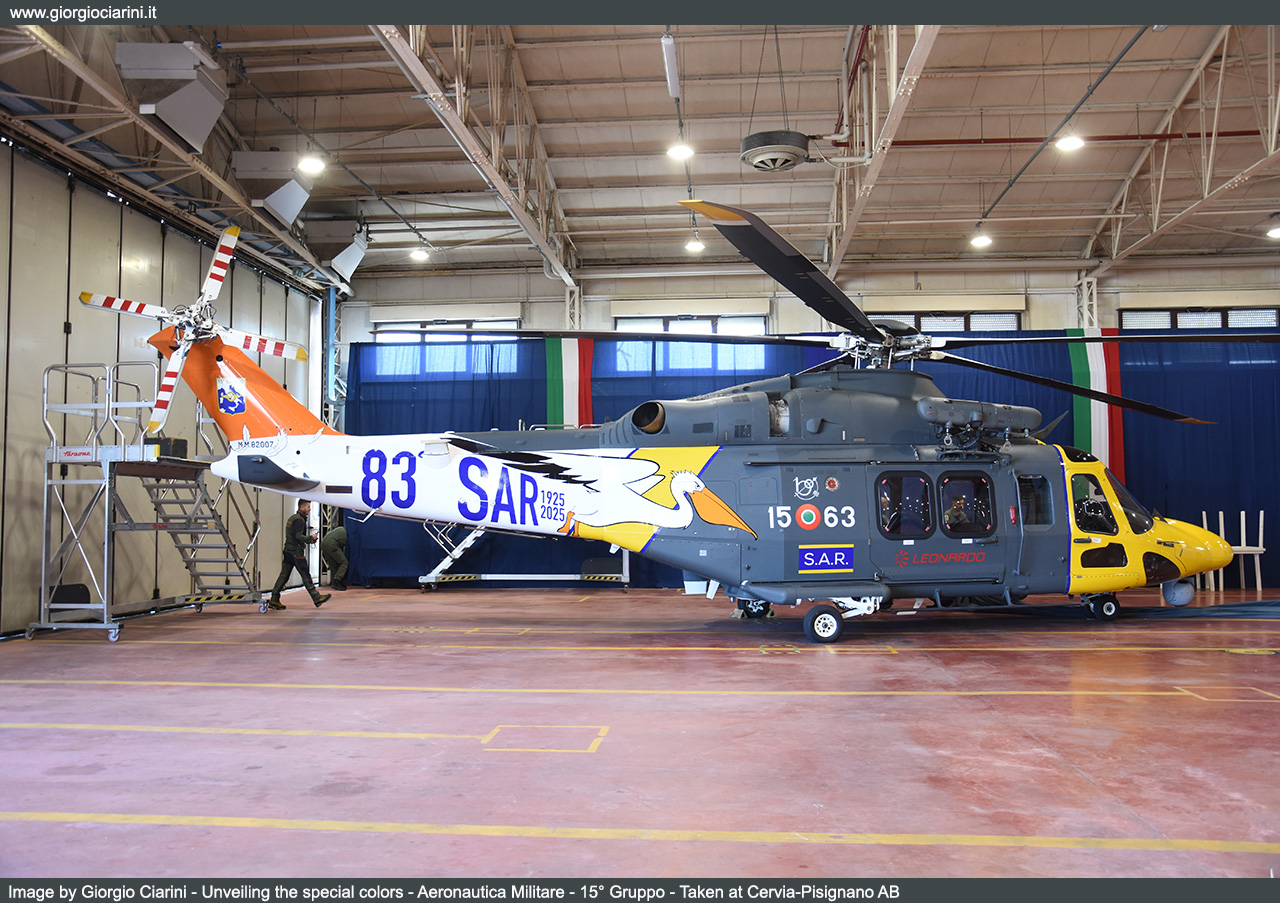 Terminata la parte commemorativa gli ospiti sono stati invitati a raggiungere di nuovo l’hangar per la presentazione di un elicottero HH-139B con una colorazione commemorativa appositamente creata per celebrare i cent’anni del Reparto. L’esemplare codificato 15-63 MM82007 è stato parzialmente “wrappato” (wrapping – tecnica che consente di rivestire il mezzo con una pellicola adesiva termoformabile) con una colorazione che riprende i colori per antonomasia del soccorso aereo, il bianco, il giallo e le “day glow” arancioni, colorazione utilizzata nei primi anni di servizio sugli HH-3F, verniciatura poi trasformata nella mimetica standard NATO grigio/verde, più consona per le operazioni prettamente militari, per poi arrivare a quella attuale mono grigia. Su entrambi i lati della deriva è stato posto il logo del Centenario, su ambedue i lati della trave di coda la scritta 83° SAR 1925 - 2025, sul lato sinistro sono stati collocati gli stemmi delle due Squadriglie dell’83° Gruppo, la 141ª e la 147ª, mentre sul lato destro è stato invece raffigurato un grande Pellicano. L’uccello acquatico esprime un antico simbolo cristiano di soccorso, amore estremo e sacrificio, rappresentante Cristo che dona la vita per l'umanità, basato sulla leggenda che la madre nutra i piccoli col proprio sangue, simboleggia l'Eucaristia (corpo e sangue donati) e la resurrezione. Sui portelloni dell’elicottero era ben visibile la scritta Leonardo, come società produttrice dell’elicottero, nonché partner economico che ha contribuito alla sua realizzazione. |
