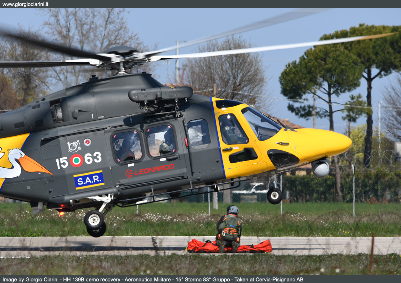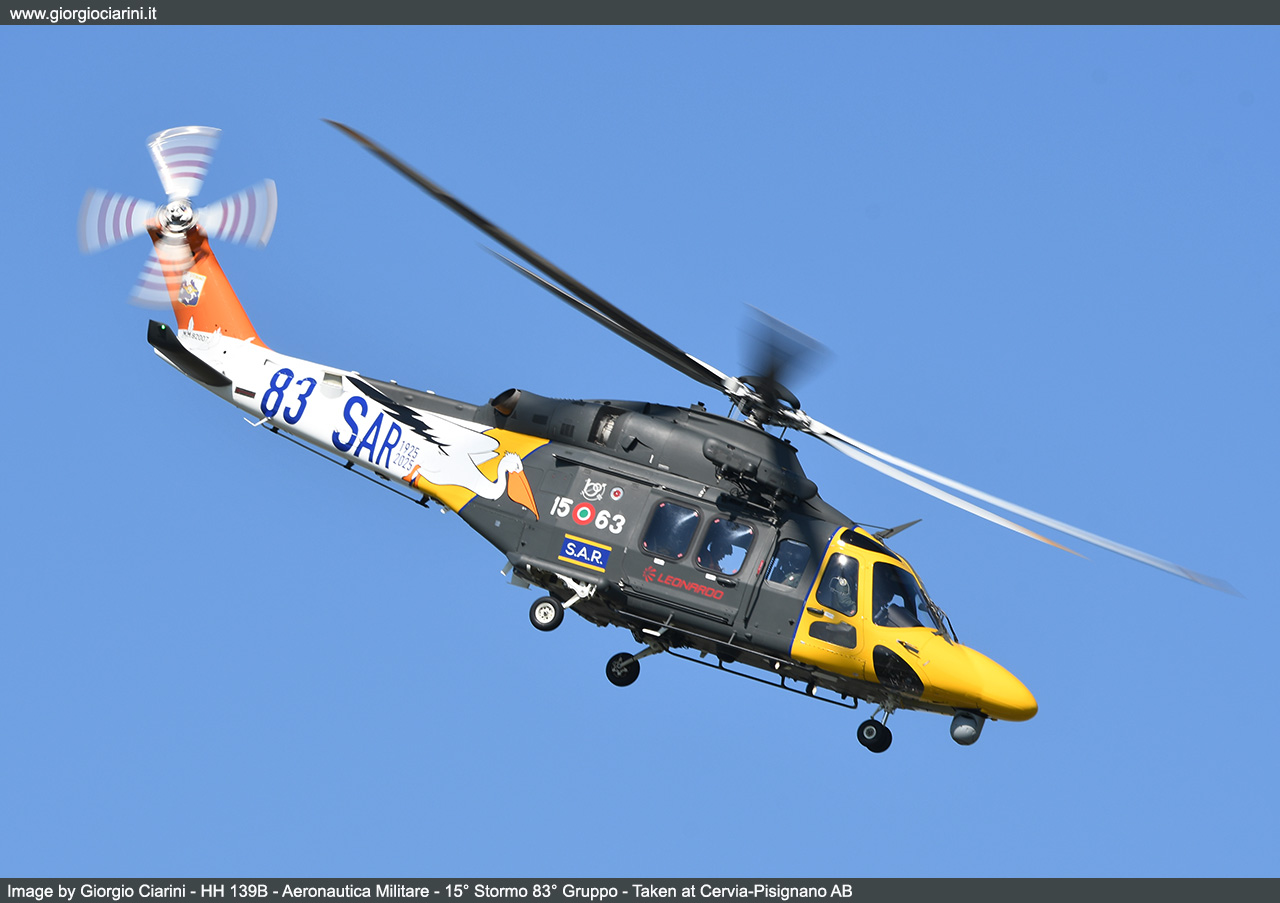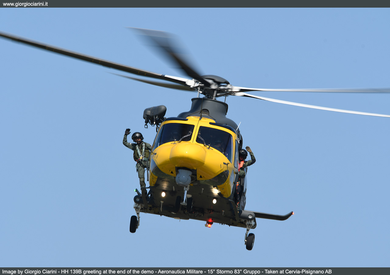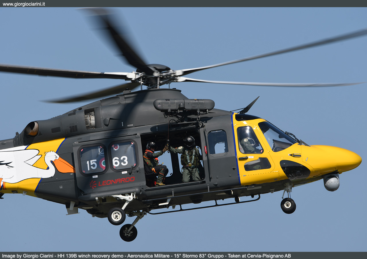 Terminata la parte commemorativa gli ospiti sono stati invitati a raggiungere di nuovo l’hangar per la presentazione di un elicottero HH-139B con una colorazione commemorativa appositamente creata per celebrare i cent’anni del Reparto. L’esemplare codificato 15-63 MM82007 è stato parzialmente “wrappato” (wrapping – tecnica che consente di rivestire il mezzo con una pellicola adesiva termoformabile) con una colorazione che riprende i colori per antonomasia del soccorso aereo, il bianco, il giallo e le “day glow” arancioni, colorazione utilizzata nei primi anni di servizio sugli HH-3F, verniciatura poi trasformata nella mimetica standard NATO grigio/verde, più consona per le operazioni prettamente militari, per poi arrivare a quella attuale mono grigia. Su entrambi i lati della deriva è stato posto il logo del Centenario, su ambedue i lati della trave di coda la scritta 83° SAR 1925 - 2025, sul lato sinistro sono stati collocati gli stemmi delle due Squadriglie dell’83° Gruppo, la 141ª e la 147ª, mentre sul lato destro è stato invece raffigurato un grande Pellicano. L’uccello acquatico esprime un antico simbolo cristiano di soccorso, amore estremo e sacrificio, rappresentante Cristo che dona la vita per l'umanità, basato sulla leggenda che la madre nutra i piccoli col proprio sangue, simboleggia l'Eucaristia (corpo e sangue donati) e la resurrezione. Sui portelloni dell’elicottero era ben visibile la scritta Leonardo, come società produttrice dell’elicottero, nonché partner economico che ha contribuito alla sua realizzazione. |